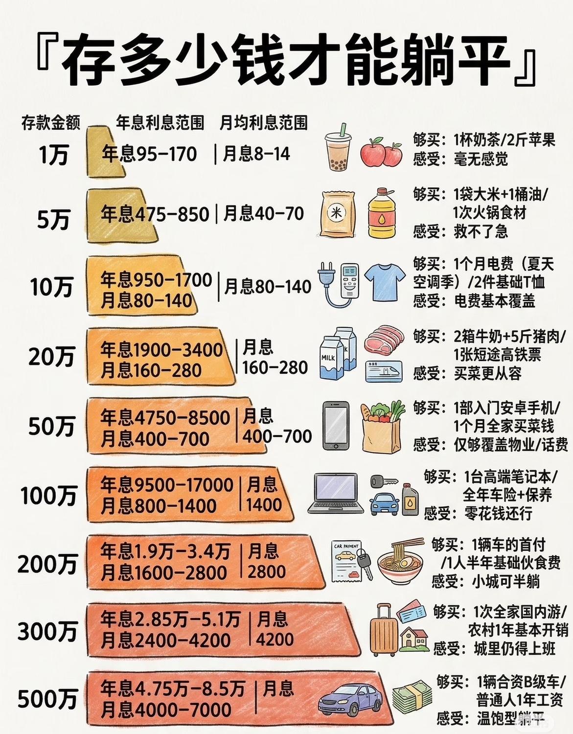 你的底气来自存款!你都存了多少钱呢? ①:存款5万,足够一个家庭一般应急,遇事不慌。 ②:存款10万,足够一个普通家庭不用工作也能支撑一年。 ③:存款20万,压力会小很多,日子会过的更舒坦一些。 ⑥:存款50万,信心满满,底气也更足一点。 ⑦:存款100万,超过了绝大多数的普通家庭,说话声音更响亮了。 ⑧:存款500万,手里有500存款的人真的不多。基本上周围认识你的人都会对你敬重,说话做事都会顾及你的感受。 人到中年,日子像被按了快进键,上有老下有小的压力如影随形,这时才懂,存款不是冰冷的数字,是实打实的底气。 当银行卡里的数字稳稳停在30万,心里那根紧绷的弦突然就松了。上班时不用再看老板脸色唯唯诺诺,不怕哪天突然失业断了收入;朋友聚会里,不用为了撑场面打肿脸充胖子,穿着几十块的纯棉T恤,也能笑着听别人聊名牌。这份踏实,是多少钱都买不来的安全感。 这30万,不是天上掉的馅饼,是每个月工资里抠出来的几百块,是放弃了无数次说走就走的旅行、推掉了没必要的酒局攒下的。它就像沉默的战友,在家人突发疾病需要手术费、孩子要交择校费的时候,能立刻挺身而出。 别指望谁会在你难的时候拿出30万帮你,亲戚朋友有各自的难处,唯有自己攒下的存款,才是最靠谱的依靠。好好存钱,就是给中年的自己,留一条最稳妥的后路。