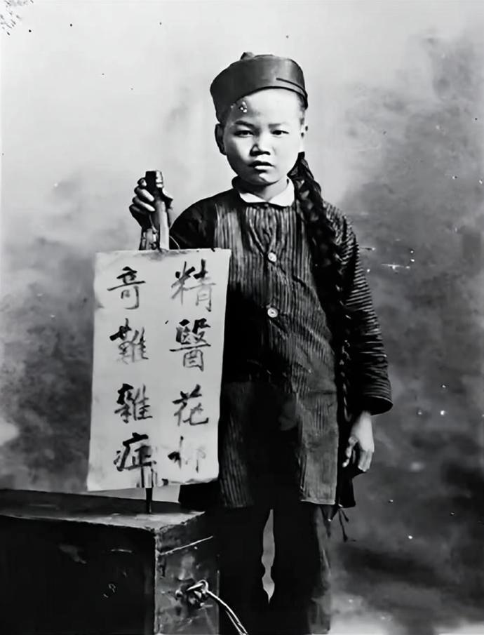 清末街头,这位留着长辫、穿粗布条纹长衫的少年,是江湖游医的学徒,他帮助师父拿着“精医花柳奇难杂症”为招牌,在街头摆摊行医。 末正规中医多为坐堂医,有固定医馆、体面身份,绝不会让少年在街头摆摊;只有走街串巷、无正规行医资质的江湖游医,才会以这种流动摆摊的方式招揽生意。这类游医大多是破产农民、无业游民,靠自学的偏方、假药谋生,专门瞄准难言之隐的病症骗钱。 花柳是清末对梅毒、淋病等性传播疾病(性病)的统称,这类病症在清末娼 妓业繁荣、人口流动频繁的城市极度泛滥;患者多为嫖客、娼 妓,因羞于去正规医馆就诊,成为江湖游医的核心客源。