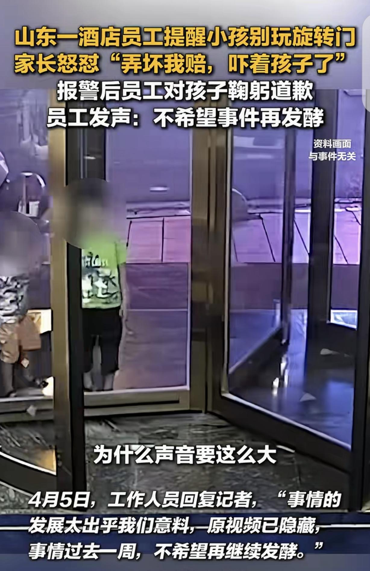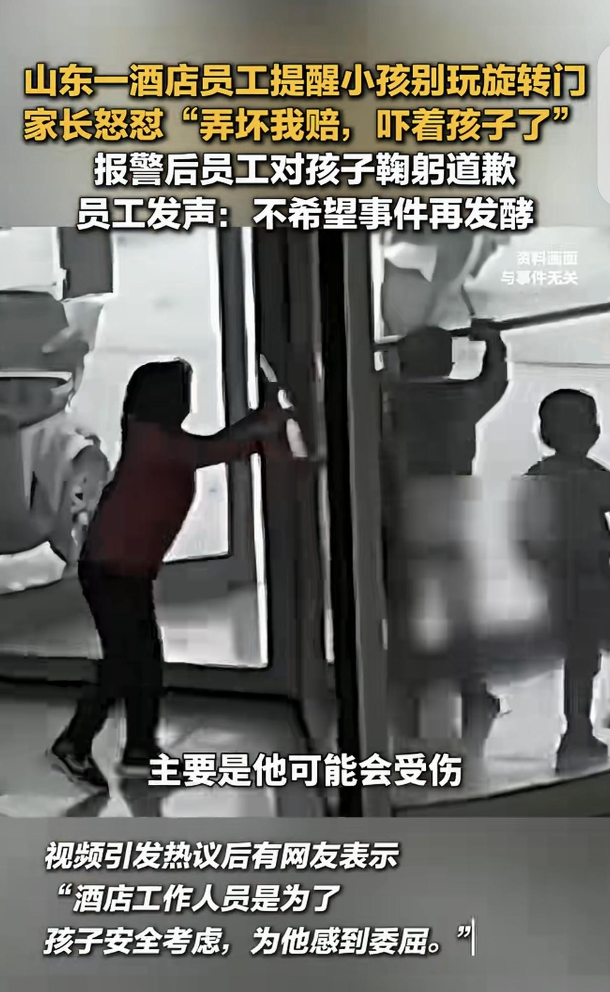 “邪不压正就是个笑话!”山东,一男子在酒店上班,他提醒一男孩别玩旋转门,男孩家长顿时火冒三丈,认为男子说话声音太大,给孩子心灵造成创伤:弄坏我赔,你吓到我娃了!不可思议的是,家长竟然报警,而警方要求男子跟孩子道歉。酒店:事情的发展太出乎我们的意料。 一男子在某酒店上班,4月4日,他刚忙完一波退房,转头看见大堂中央的旋转门旁,一小男孩正把旋转门当玩具。 男孩攥着把手使劲转,好几次差点撞到进门的客人,自己也差点被旋转门撞倒。 男子赶紧走过去,声音不算小地提醒了句:小朋友不能这么玩,小朋友快出来。 男子是好意,他怕男孩夹着手或是撞到他人。 换做一般家长,多半会赶紧拉过孩子道谢,可这孩子的家长,不知道是他父亲,还是爷爷或者外公,反正画外音听着是一个男士。 家长当场就炸了。他鼻子不是鼻子脸不是脸,指着小伙的鼻子就咆哮如雷。 家长说男子声音太大吓到孩子了,给孩子心灵造成无法挽回的创伤了,还说酒店员工就这素质,连个说话的分寸都没有。 男子当时就懵了,自己明明是好心提醒,怎么就成了“吓到孩子”?说自己声音太大,他和孩子有一段距离,不大点声,孩子不一定能听见。 再说了,自己说话的声音明明是正常的,也大不到哪里去,怎么就能把孩子吓到? 说声音大,反倒是这个家长,不是正常说话,都成怒吼了。 男子压住火,毕竟顾客是上帝,他心平气和赶紧解释,这样危险,主要是怕孩子受了伤。 但家长咄咄逼人,不依不饶,一口咬定男子声音太大,跟孩子说话肯定吓到他了。 家长不由分说,掏出手机报了警,说酒店员工对未成年人进行“言语恐吓”,要求小伙给孩子道歉。 更让所有人意外的是,民警到了之后,听家长说完,居然也让男子给孩子道个歉,说多一事不如少一事,免得把事情闹大。 男子看着周围围观的客人,又看看民警认真的表情,心里又气又委屈,最后还是当着众人的面给孩子说了句“对不起”。 这事在酒店内部传开后,员工们都觉得心寒。本来是出于责任心的提醒,却落得个道歉的下场,以后谁还敢管? 如果不管,孩子受伤,或者摔倒,家长又会找酒店问责,怎么做都难。 说现在的家长太惯着孩子,一点委屈都受不得,也有人吐槽这种处理方式,明显是和稀泥,根本没站在理的一边。 我倒觉得,这事里最受伤的不是男子,而是那个被护在身后的小男孩。 家长用这样的方式“维护”他,只会让他觉得自己做什么都有理,别人善意的提醒都是恶意的针对。 以后他再在公共场合胡闹,恐怕没人敢再出声制止,真要是出了意外,谁能负这个责? 如果他在这种家庭教育下,长大了还不为所欲为,肆无忌惮,这不把孩子毁了吗? 好心提醒反倒要道歉,简直是在寒责任心强的人的心。 家长护娃没错,但也得分清是非曲直,孩子在公共场合瞎闹,本来就该管,员工提醒是尽职责,凭啥要背锅? 这种“和稀泥”的处理方式更不可取,看似息事宁人,实则是在助长歪风邪气,以后谁还敢管公共场合的闲事?真要出了意外,哭都来不及。 《民法典》第1198条规定,宾馆等经营场所未尽到安全保障义务,造成他人损害的,应当承担侵权责任。 酒店员工提醒孩子避免危险,是尽安全保障义务的表现,不存在过错。 家长以“吓到孩子”为由要求道歉,缺乏法律依据。 让员工道歉的处理方式并没法律支撑,如果因此给员工造成名誉损害,员工可依法主张权利。 对此,你怎么看?