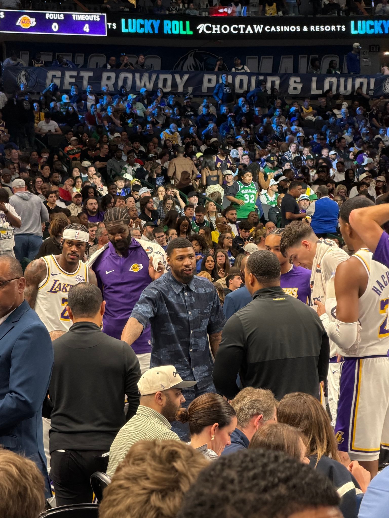 湖人队这关键的10分一直没追上,好在也没有被拉开。斯玛特场边指导。湖人vs独行侠