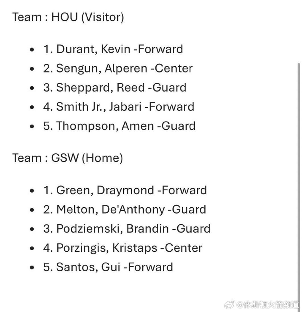火箭vs勇士 双方首发,库里复出但未进入首发阵容