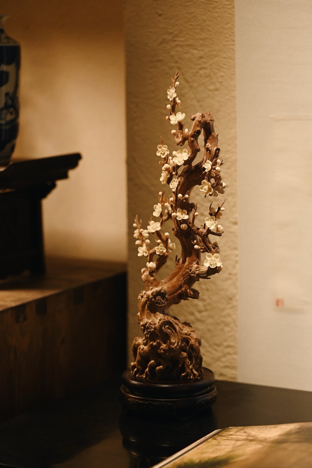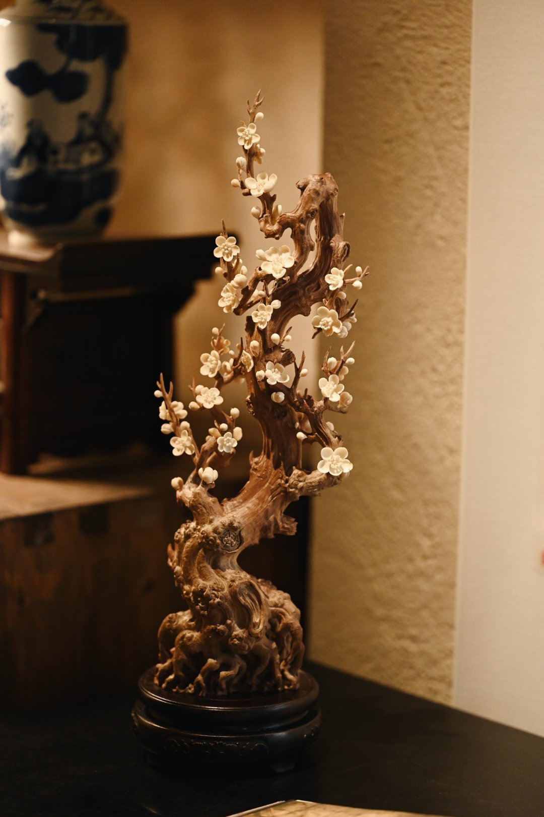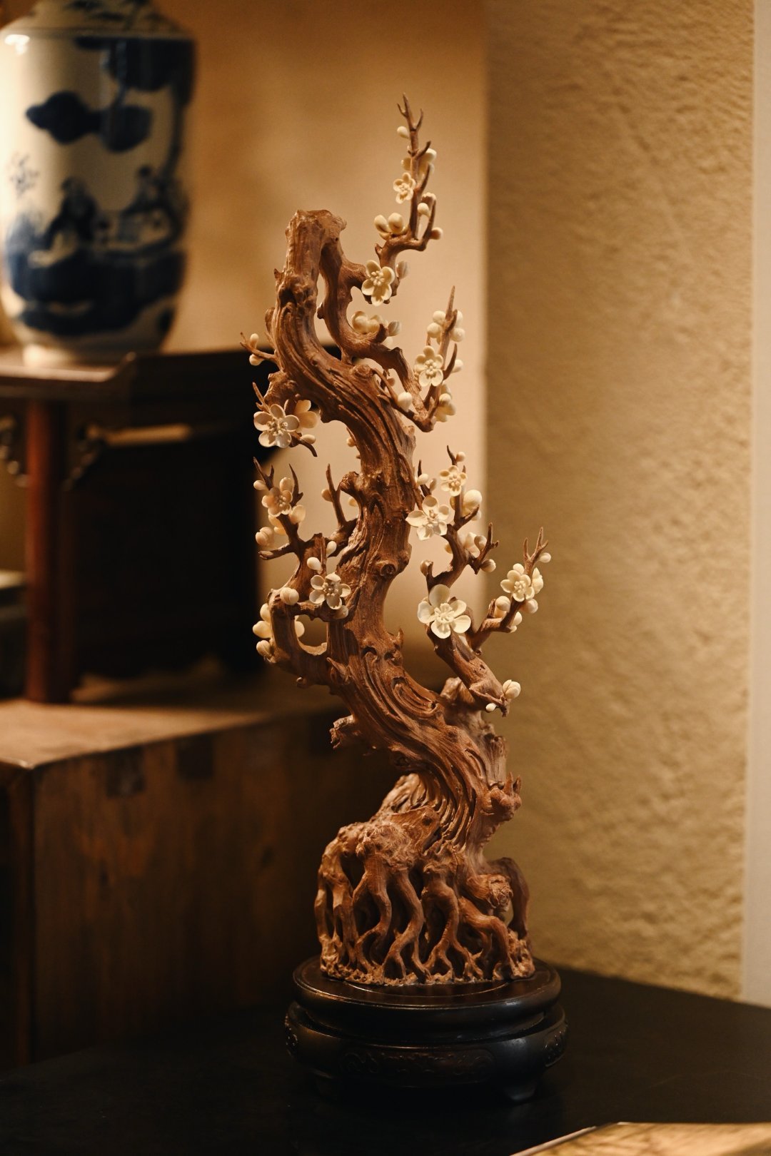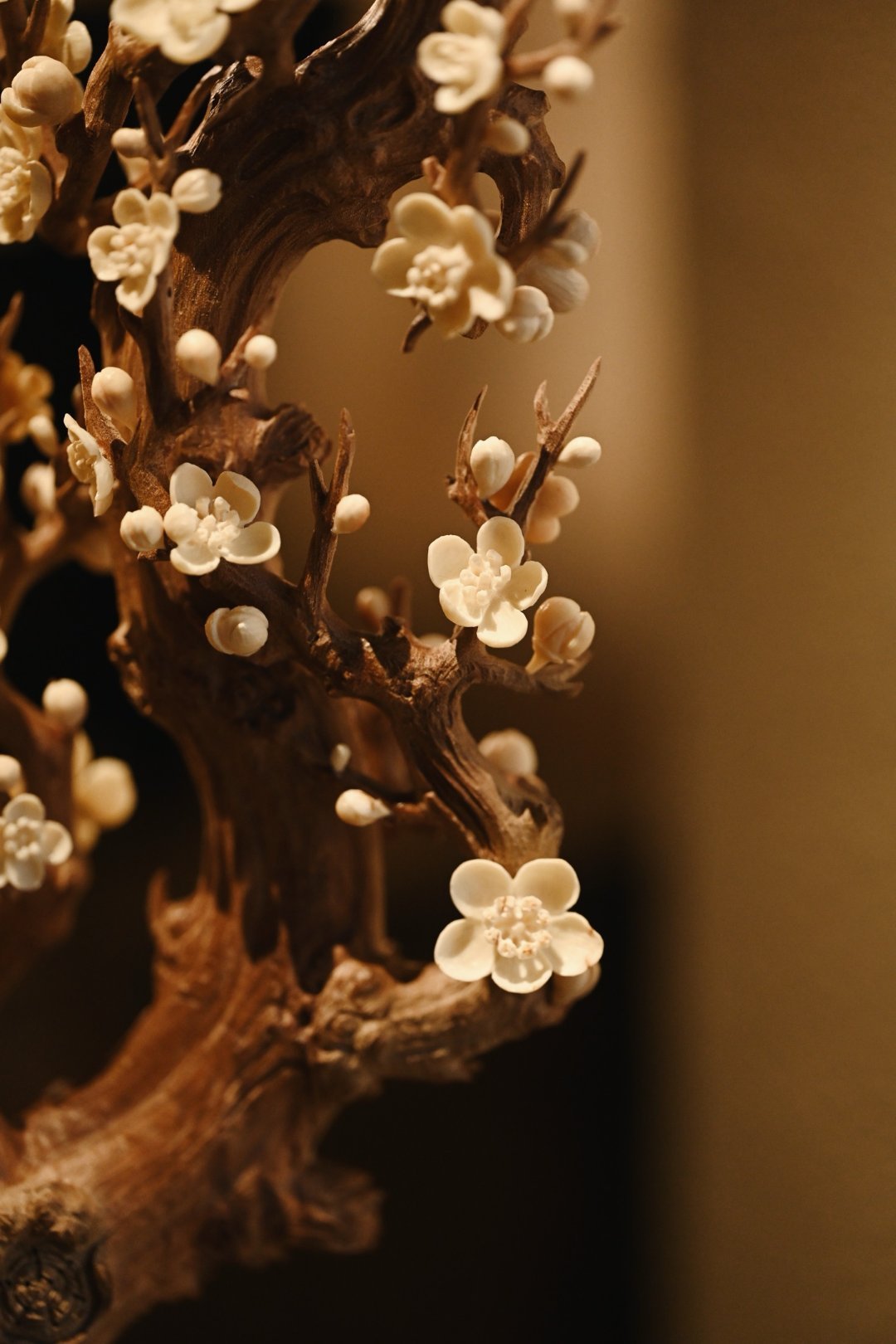 以刀为笔,刻梅风骨。老干虬劲,尽显岁月沧桑;枝桠疏朗,如诗如画,尽显文人傲骨;梅花冰清,玉洁剔透,置文房茶室,气韵清雅。