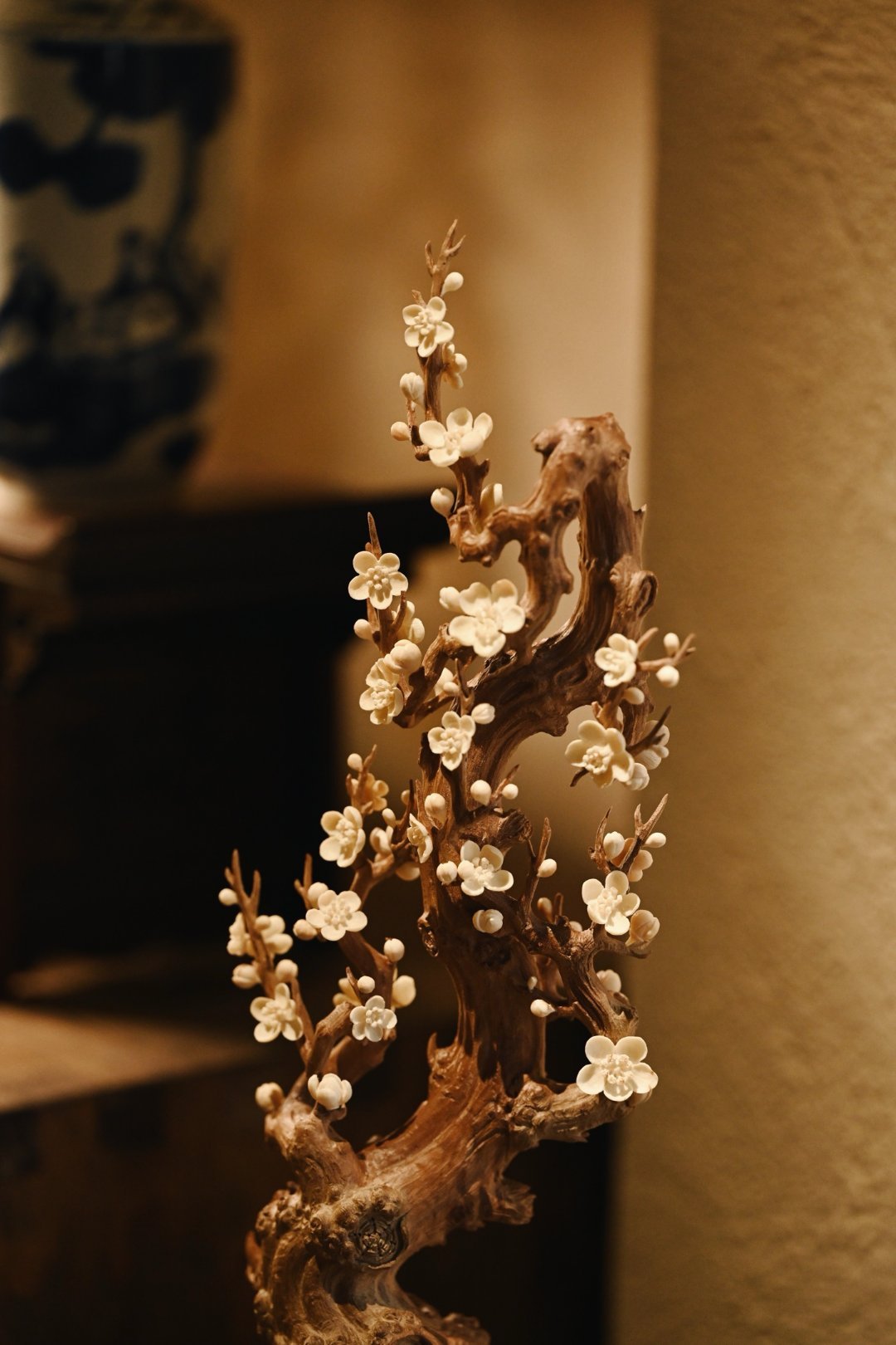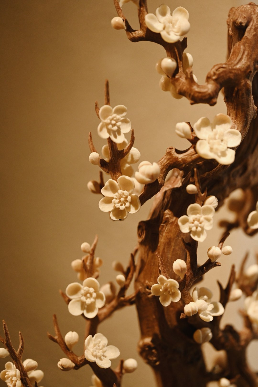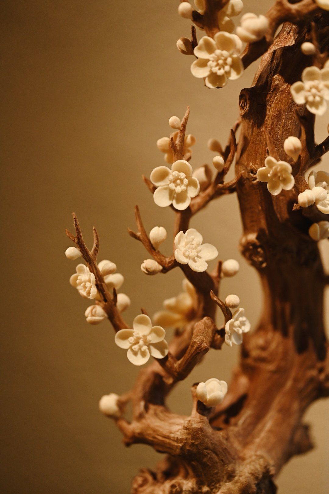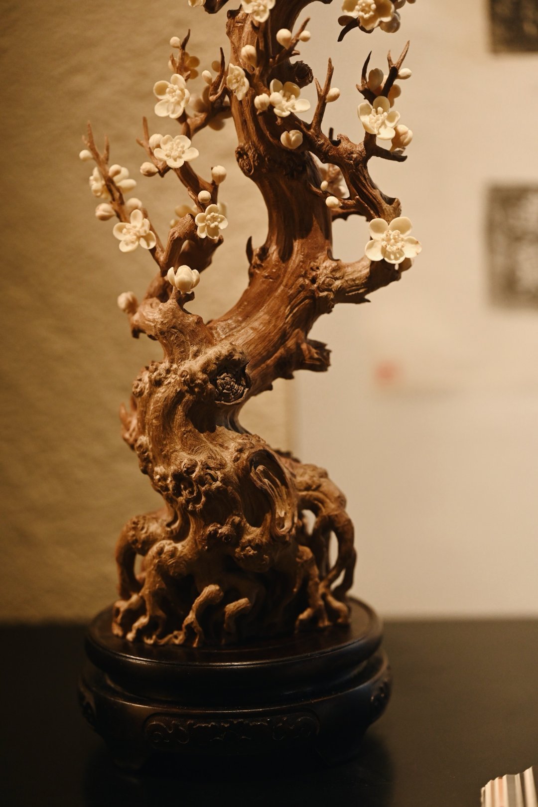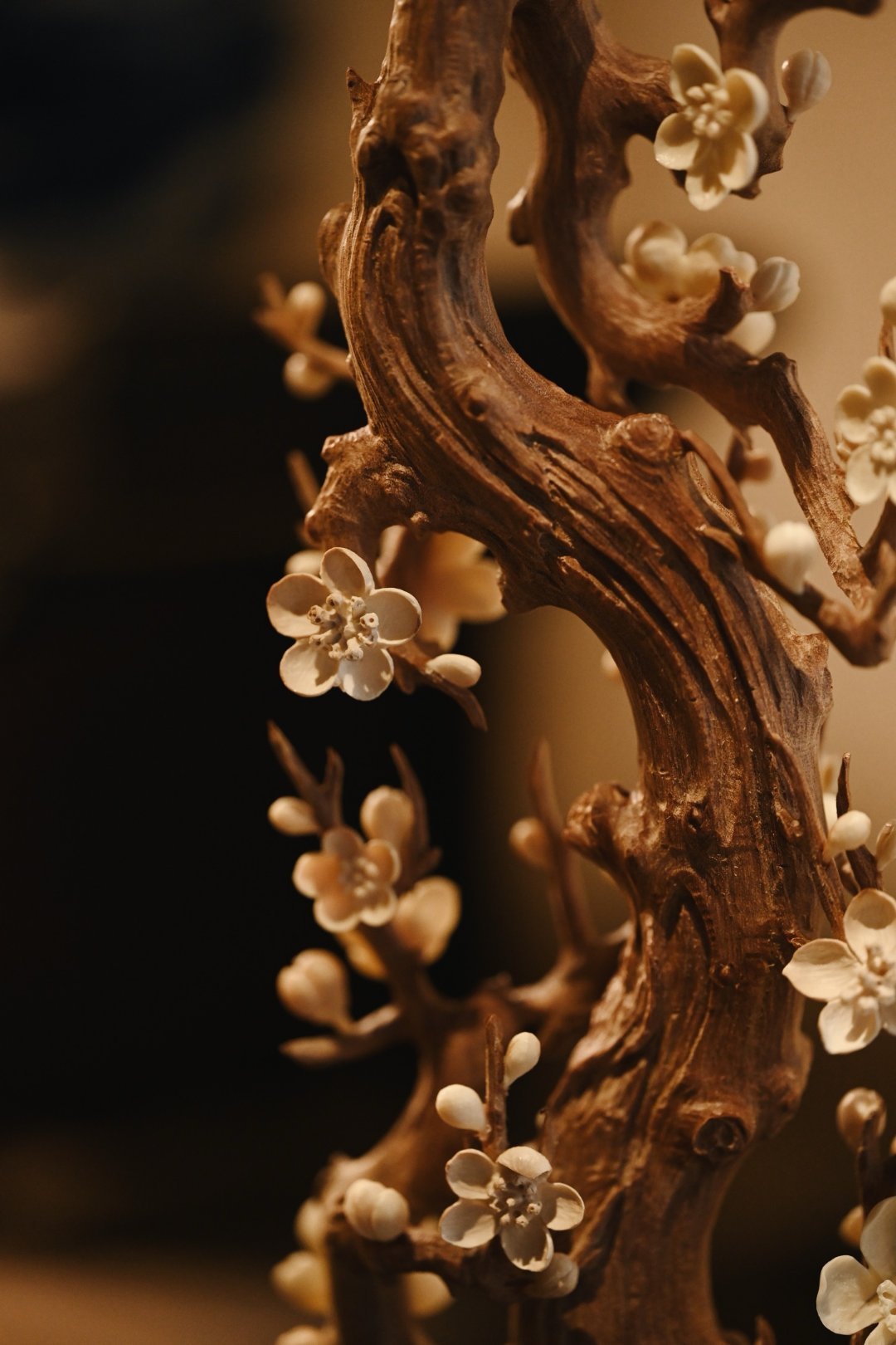 以刀为笔,刻梅风骨。老干虬劲,尽显岁月沧桑;枝桠疏朗,如诗如画,尽显文人傲骨;梅花冰清,玉洁剔透,置文房茶室,气韵清雅。