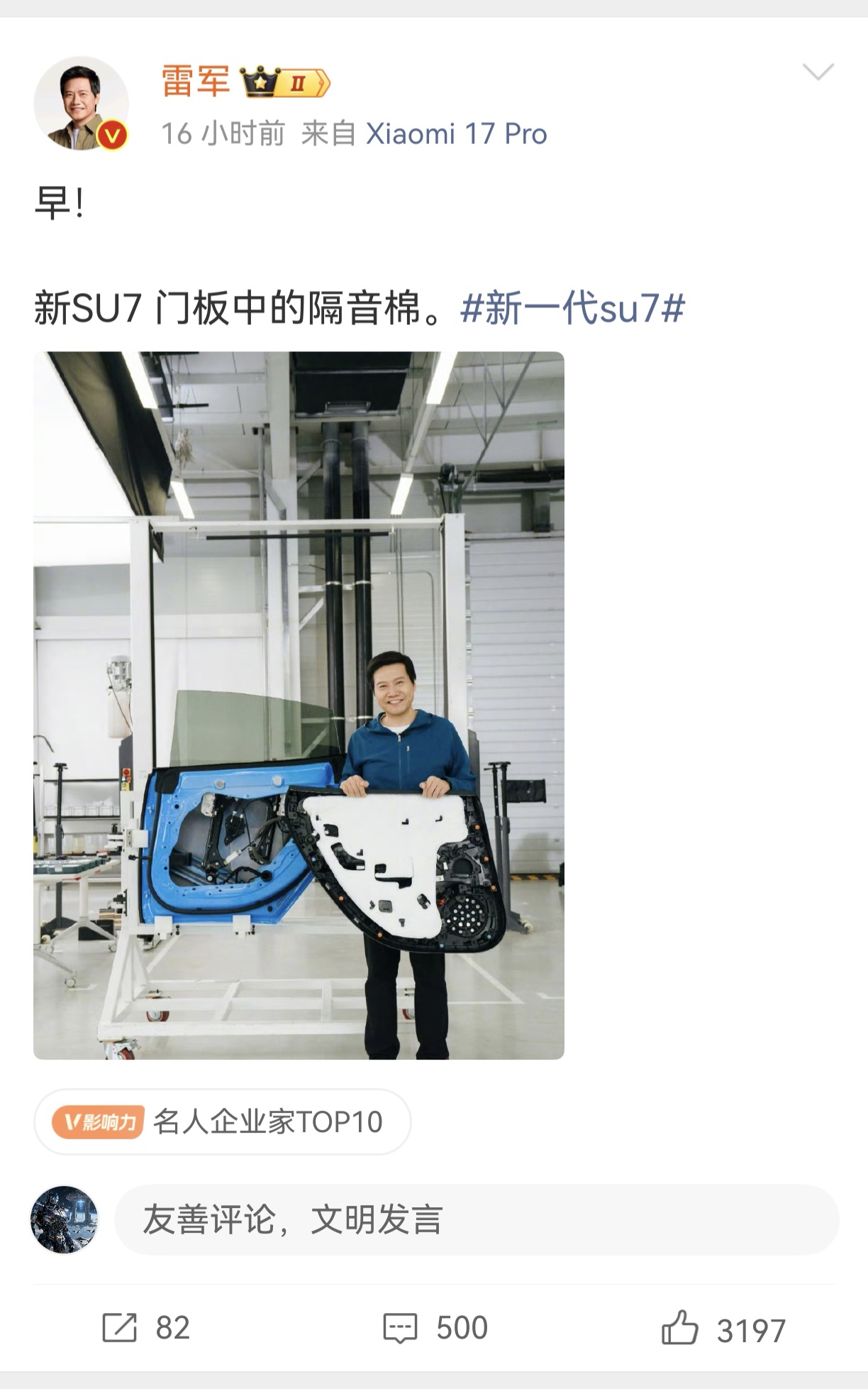 近日雷总在微博发文晒新一代SU7的车门隔音棉,据悉这款新车的隔音棉静谧性非常好,而且拆车时可以发现,车内内饰板几乎全覆盖厚层吸音棉,这堆料确实良心。