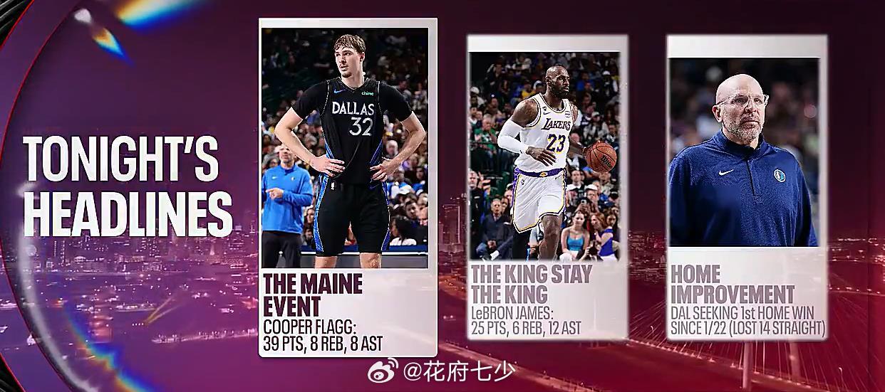 虽然成就了对面肯纳德职业生涯第一个三双,但不妨碍面对也不得不体会一把“下一个人站出来”的湖人主场14连败后终于赢下一场独行侠战胜湖人弗拉格45分