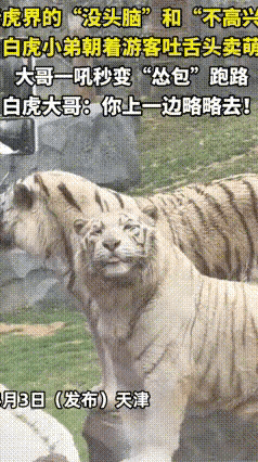 最近天津动物园这段老虎视频火了! 一只白虎对着游客调皮吐舌,疯狂"卖萌",完全没了百兽之王的威严。 结果旁边的虎大哥看不下去,立马一声低吼"教育"它。刚才还活泼的"萌虎"瞬间秒怂,夹着尾巴灰溜溜地走开,不敢再调皮。 网友表示: 一个负责威猛,一个负责可爱,真是猛虎与萌虎的完美组合! 吐舌的白虎,真是难得一见,太让人稀罕了,这表情包,抢了虎大哥的威风,一声低吼虎吟,卖萌的虎弟,瞬间知趣走开,这场景太逗乐,萌虎被教育很有意思,两兄弟互动招人爱 对此,你怎么看?