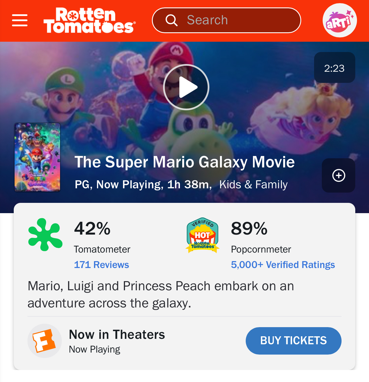 《超级马力欧银河大电影》全球票房又爆了!上映前5天全球票房收入达3.72亿美元,北美首周末票房高达1.3亿美元,成为今年北美开画票房最高的影片,制作预算为1.1亿美元。