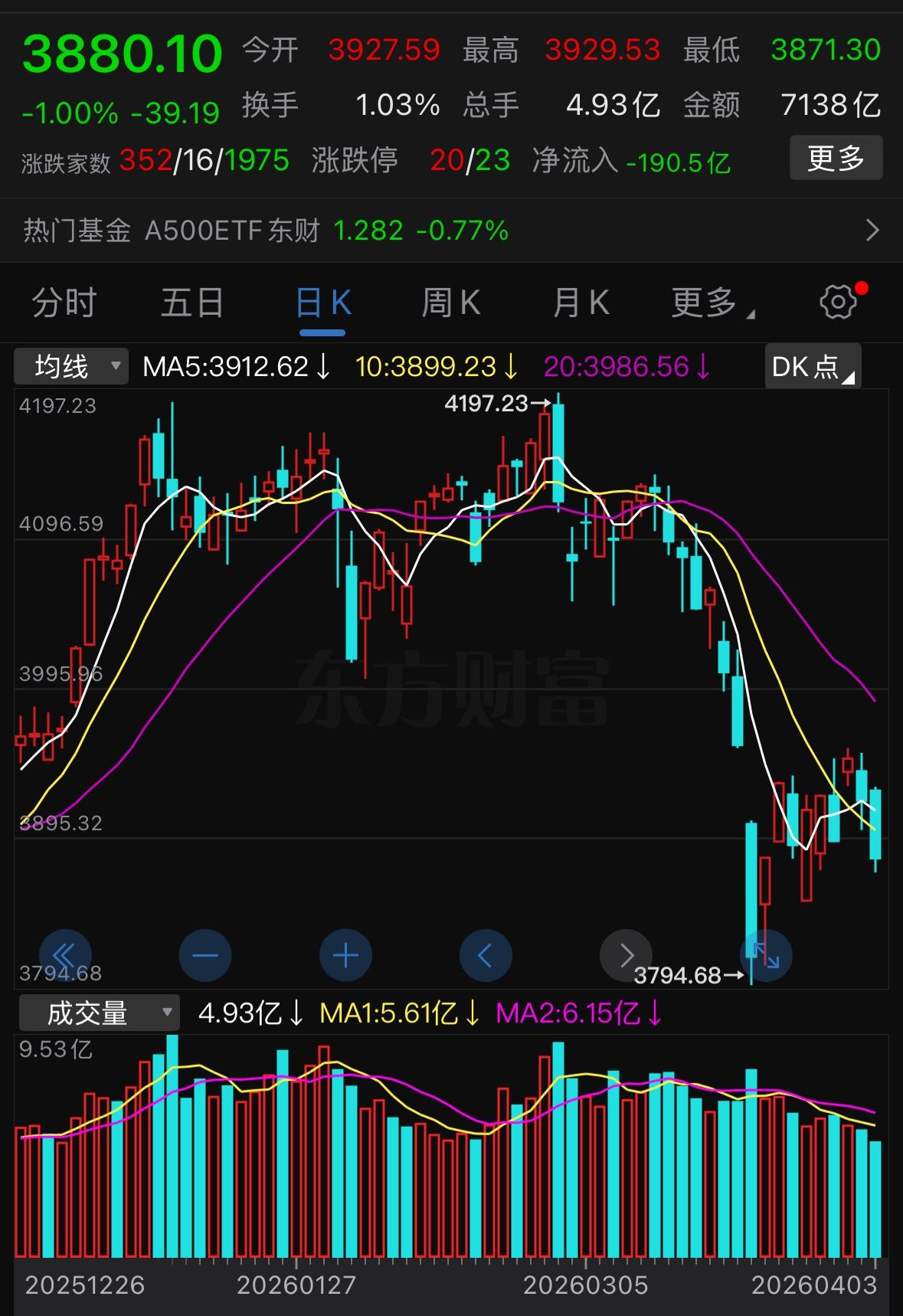 各位朋友注意了,近期加息周期下市场风云变幻,各类消息层出不穷,很多人都在关心接下来行情会怎么走、我们该如何应对。 从技术面上来看,截至目前,市场依旧没有出现明确的转势信号,这段时间行情确实让人煎熬,近两周多数个股都维持横盘震荡,只是此前有所反弹,在上周四、周五又再度回落,重新回到前期低点附近。 相比之前的低位,现在投资者的心态反而更难熬,当初只是账面浮亏,而现在长时间震荡磨底,不仅有浮亏,心理上也备受煎熬,持股信心越来越弱,心态越来越低迷,不少人都快要坚持不住,市场就是如此现实且残酷。从整体走势来看,目前依旧没有明确的见底信号,指数在下方3850点、上方3950点区间内反复震荡,一旦回踩至3850点附近跌势放缓,出现止跌企稳或放量信号,就是值得关注的机会。 另外加息阶段外围消息纷杂,让人看得心惊,但A股今日开盘全线走强,富时中国A50指数同样上涨,从市场表现能看出,中东局势带来的影响正在逐步减弱,随着市场逐步消化相关情绪,后续行情也会慢慢回归自身正常运行节奏。当前市场磨底仍需要时间,这一轮调整到现在已经持续一个多月,4月份出现阶段性见底的概率很高,我们保持耐心静待时机即可。