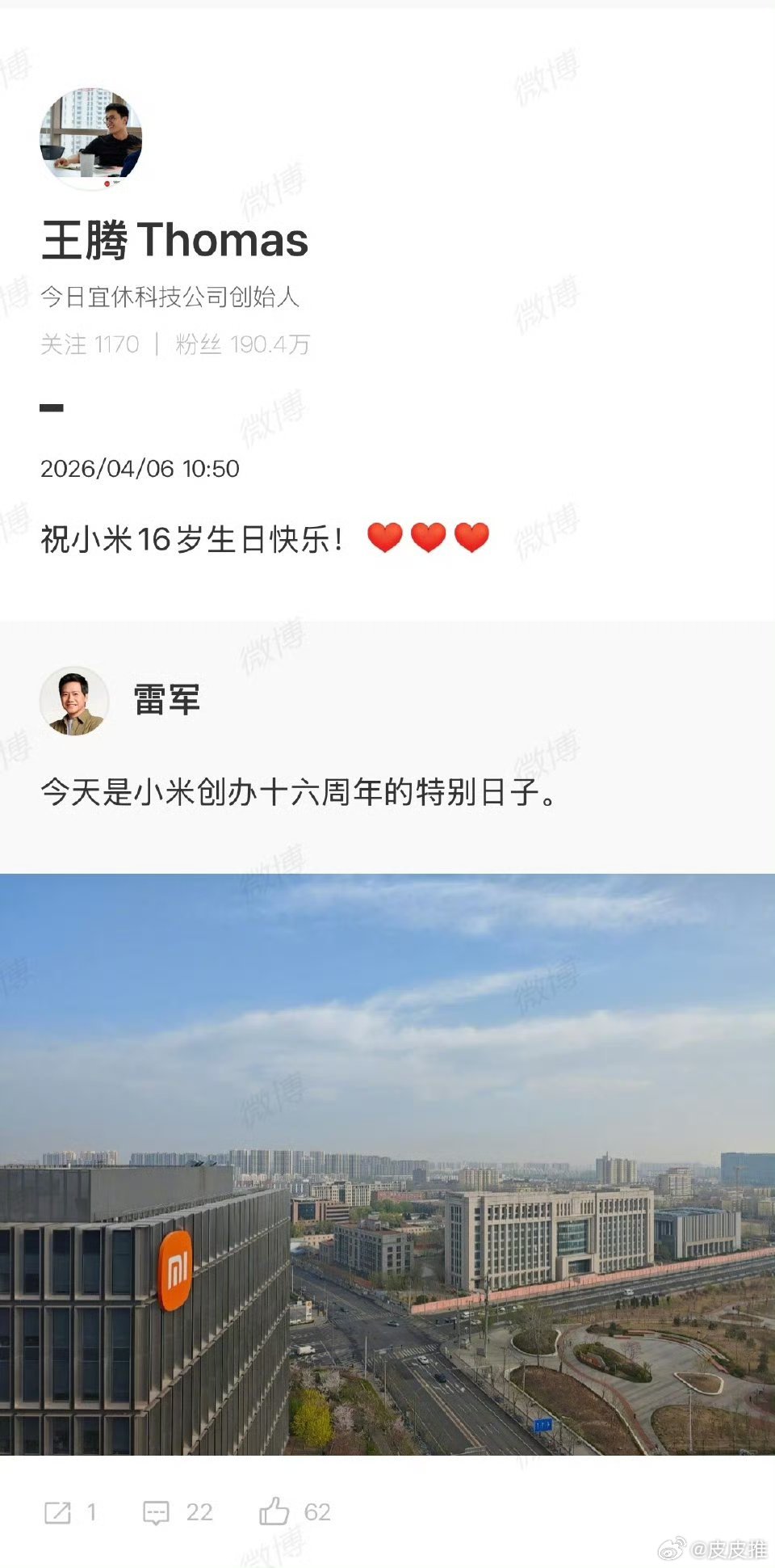 王腾:祝小米16周岁生日快乐。