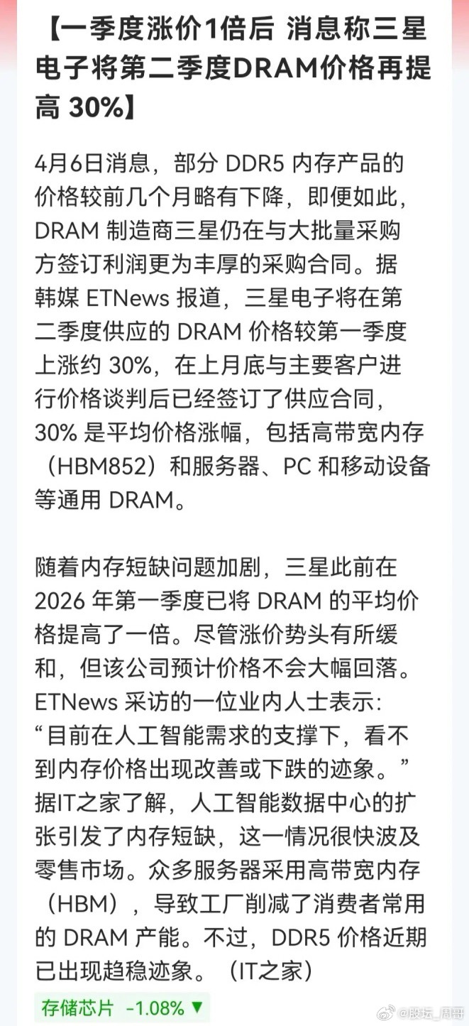 就在刚刚消息传来,据韩媒 ETNews 报道,三星电子将在第二季度供应的 DRAM 价格较第一季度上涨约 30%,在上月底与主要客户进行价格谈判后已经签订了供应合同,30% 是平均价格涨幅,包括高带宽内存HBM852和服务器、PC 和移动设备等通用 DRAM。