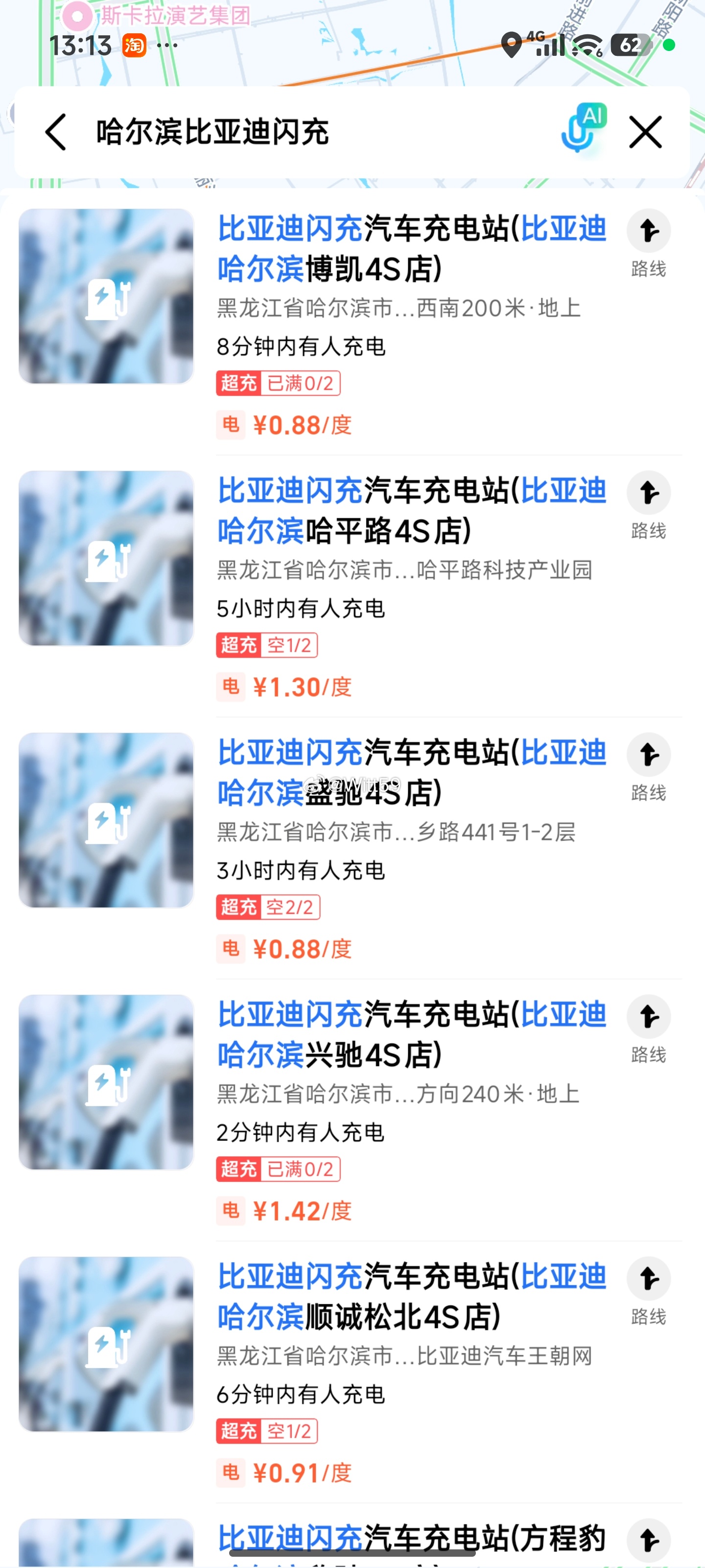 我查了一下哈尔滨的比亚迪闪充站,还是不少的,可是怎么都在4S店?