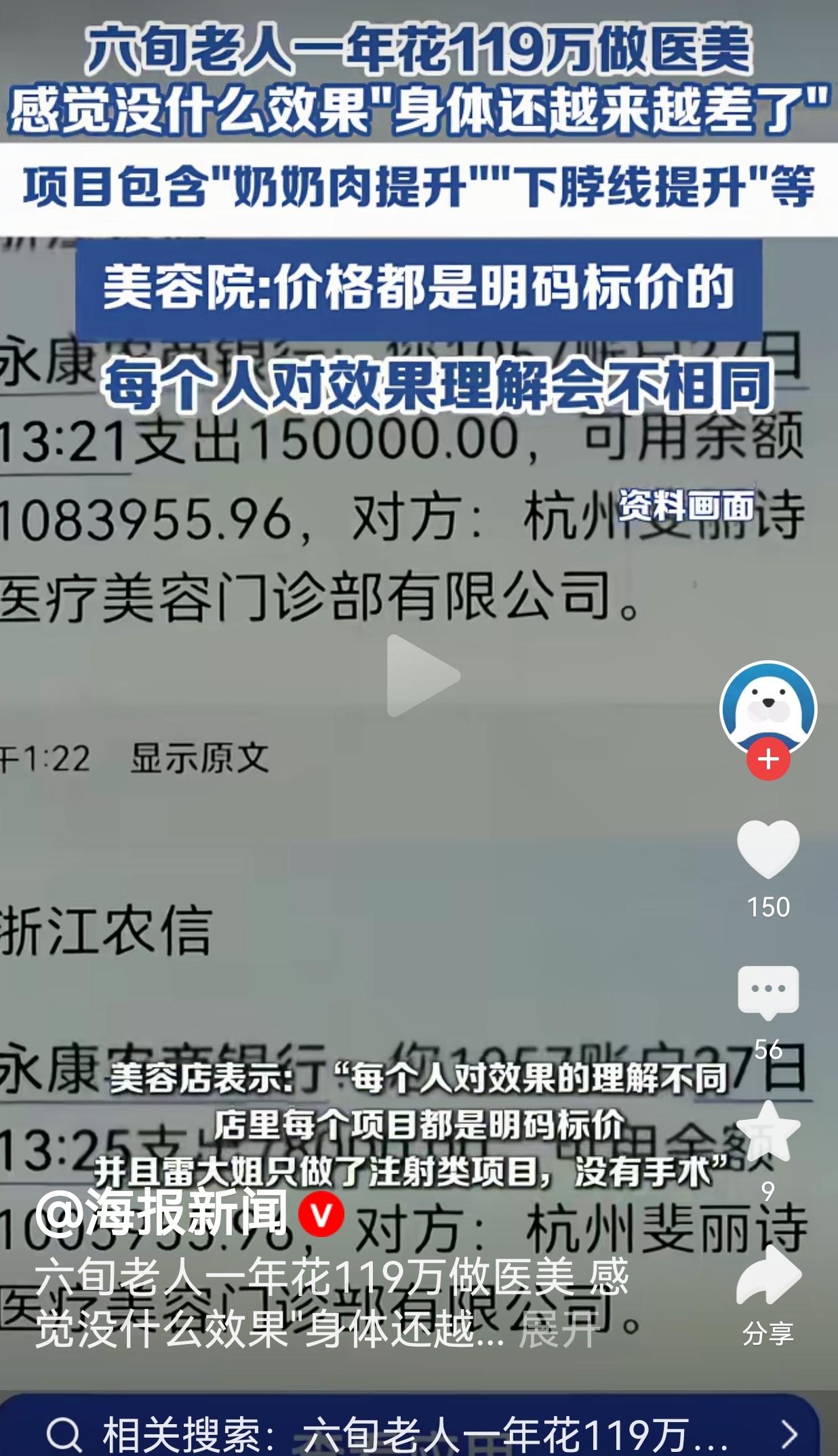 太离谱了!61岁的雷大姐把一辈子攒的119万养老钱,全砸进医美机构了,结果脸没年轻半分,身体反倒垮得一塌糊涂,找机构讨说法,对方居然轻飘飘甩一句“每个人对效果理解不同”,这波操作真的把人肺气炸! 咱先把事儿掰扯清楚,这雷大姐今年61岁,本来是该含饴弄孙、跳广场舞的年纪,常年被轻微抑郁症缠着,睡不好觉、情绪也低落。 去年她在网上认识了个武汉做微商的李女士,对方天天给她灌“女人要活得漂亮”“要对自己好一点”的鸡汤,还先给她推保健品慢慢拉近距离,一步步把她哄得团团转。 后来李女士给雷大姐甩了个杭州斐丽诗医疗美容的“高定美学”链接,说这儿能让她变年轻、气色好起来。 雷大姐一听就动了心,跟着李女士去了杭州钱塘航空大厦的医美机构。一进门人家就耍套路,说“先充5万才能咨询”,李女士还当场充钱拍胸脯“放心充,没问题”,架不住热情和变美的念头,雷大姐当天就稀里糊涂转了27.8万,做了除皱、少女针、线雕这些项目。 那会儿雷大姐银行卡里还有100多万余额,可在商家眼里,这就是块待宰的大肥肉!之后5月、7月,李女士又以“复诊”为由把她叫到店里,雷大姐又先后刷了51.6万、39.78万,一年三次消费,硬生生把119万养老钱全造没了! 雷大姐本来盼着做完能年轻十岁、精神点,结果呢?据雷大姐提供的术前术后照片对比,脸上半点儿变化都没有,那些花十几万做的“额部填充”“奶奶肉提升”“下脖线提升”,纯属白花钱! 更糟的是,她术后头晕、严重失眠,原本的抑郁症直接复发,去医院查了半天,也没查出明确病因,只知道身体一天比一天差。 等雷大姐想找当初哄她的李女士讨说法,才发现自己早被拉黑删好友,彻底失联了! 她只能找医美机构,结果对方翻脸不认人,说“不清楚李女士介绍的事,是她们之间的事儿”,还嘴硬“项目明码标价,效果因人而异”。 协商退款时,机构从只退10万涨到20万,对着119万的总消费,简直是杯水车薪! 咱就是说,这事儿换谁能忍?雷大姐一辈子省吃俭用攒的养老钱,就这么被忽悠着花光了,不仅没换来美,还把身体熬坏了,那种无助和委屈,真的戳心窝子! 网友看到后评论说:这哪是做医美,这是被人当肥羊宰了吧!119万带老人去环游世界、吃遍美食,身体养得棒棒的,不比这强? 也有的网友说:现在有些医美机构也太没底线了,专挑老年人下手,利用老人想变美、想开心的心理忽悠,真的太缺德! 还有的网友说:“效果看理解”?合着你卖的是医疗服务不是玄学啊?没效果还把人身体搞坏了,凭什么不退钱? 也有的网友说:“心疼雷大姐,家里人要是早点发现,也不至于让她被骗这么多钱,老年人真的太容易被这些漂亮话忽悠了。” 我真的越看越气!这些医美机构太懂怎么拿捏老年人的心理了,抓住老人想变美、缺情感关怀的短板,用“漂亮话”当诱饵,用“套路”圈钱,把老人的养老钱当成自己的利润,完全不顾及老人的身体和权益! 更让人寒心的是,机构明明知道项目没效果,还拿“效果理解不同”甩锅,把责任推得一干二净。医疗美容不是儿戏,是关乎健康的医疗行为,有没有效果不是靠嘴说,不是靠“个人理解”,而是看实实在在的改变和对身体的影响! 咱也不是说不能做医美,年轻人适度医美没问题,但针对老年人的医美消费,真的该好好管管了!子女们多关注家里老人的情绪和消费,别让他们被陌生人的甜言蜜语哄骗;监管部门也得严打这种针对老年人的医美套路,别让更多雷大姐这样的老人掉进陷阱! 说到底,真正的年轻漂亮,从来不是靠打针填充堆出来的,是身体硬朗、心里踏实,是家人的陪伴和安稳的日子。119万买不来虚假的青春,却能看清人性的贪婪,别让养老钱变成医美机构的“割韭菜”工具,别让爱美的心被无良商家狠狠利用! 美是由内而外的底气,不是花钱堆出来的假象,别让医美陷阱,毁掉老人的晚年安稳! 对此,你怎么看?