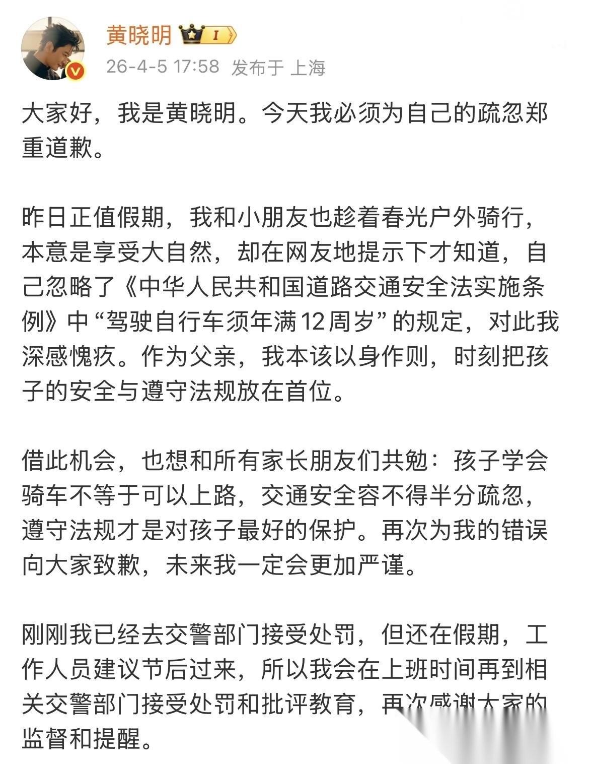 4月5日17:58,黄晓明在社交平台公开发文。令人没有想到的是,这一次,黄晓明不是分享他悠闲幸福的父子时光,而是发了份检讨书。 起因挺让人哭笑不得。前脚刚发了带儿子骑单车的温馨合影,后脚就被眼尖的网友抓了包。 按交规,小孩骑车上街得满十二周岁。 本来想秀把父爱,结果成了反面教材。 遇到这种翻车现场,娱乐圈常见的套路无非两招:要么删帖装死,要么甩个冷冰冰的工作室通稿。 黄晓明没按套路出牌。人家一句借口没找,直接跑去交管部门把罚单领了。 从公关角度算这笔账,这步棋走得很实在。与其被人戳着脊梁骨骂名流搞特权,不如踏踏实实立正挨打。低头认错是丢了点面子,但靠着这波诚恳的态度,早就把路人缘赚回来了。 这次栽跟头,也算栽出了点社会价值。 咱们平时走在街上,随便就能瞅见刚上小学的孩子在车流里骑得飞快。不少当父母的甚至觉得自家骨肉运动天赋高,压根没把安全盲区当回事。 明星的示范效应,恰好就体现在这儿。用一场尴尬遭遇,给全天下家长敲响了警钟。 爱娃不能大过规则,马路更不是任性撒野的游乐场。 成年人最大的体面,从来不是永远不栽跟头。 而是摔倒后能大大方方认个错,顺道给大伙儿避个坑。对此,你怎么看?