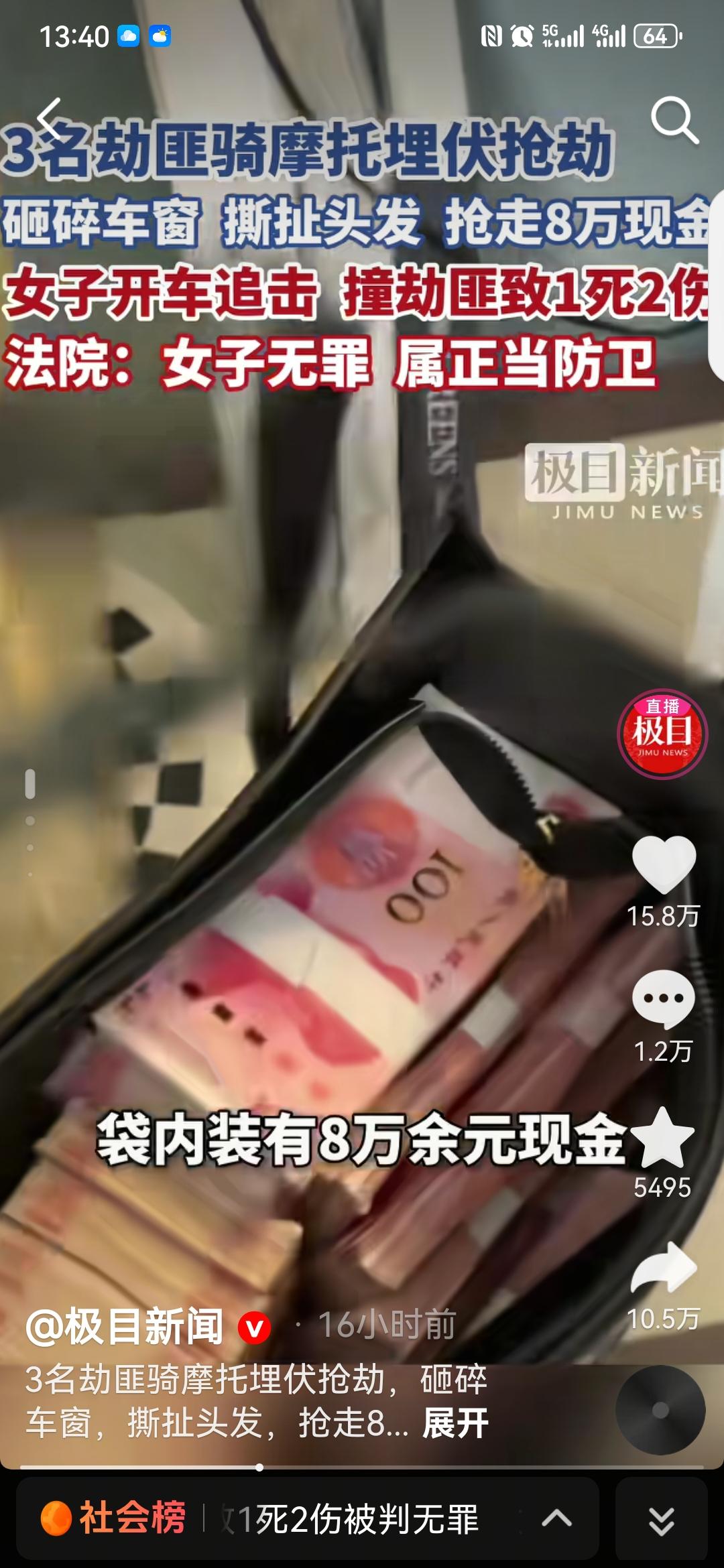 这是我看到最痛快,最解气,最弘扬正义的判决,必须支持广东法院! 最近有这么一个新闻,让人耳目一新,心清气爽,畅快淋漓,快意恩仇! 在广东佛山市顺德区,37岁的荣女生正发动汽车准备出发,结果三名早已埋伏在车库门口的三名劫匪突然出现,先是猛砸汽车玻璃,然后从副驾驶座位上将装有8万元现金的手提包抢走,然后驾驶摩托车逃离,这个时候,还没有醒过经儿的荣女生,发动汽车追击劫匪,然后将劫匪的摩托车撞倒,最后一名劫匪当场死亡,另外两名劫匪受伤。 法院经过庭审,认为荣女生从劫匪抢包,到驾驶摩托车离开,都没有脱离荣女生视线,可以认为撞车现场就是抢劫现场正在发生的犯罪现场,荣女生对劫匪的撞击是为了制止犯罪发生,最大程度减少自己生命财产损失,属于正当防卫。 多少年来,多少个关于当事人在防卫中致人死亡的案例,都是在法官的纠结中,社会的争议中理不清头绪,下不了结论,产生了很多负面影响。 广东佛山市法院丁就是丁,卯就是卯,劫匪就是劫匪,防卫就是防卫,没有那么多的责任考量,人死有理的拖泥带水,各种剪不清理还乱的方方面面的考虑,直接就是判荣女生属于正当防卫,无需承担刑事责任。 有的法官或者律师往往有这样一中思维,劫匪有罪,但罪不至死。 这种观念在西方法律体系中是站不住脚的,没有市场的。你是一个成年人,你采取了暴力方式侵犯别人的人身财产安全,对于别人采取的保护和防卫措施,造成各种后果,你就要全部承担责任。 最后,呼吁大家给广东法院点赞,大力支持这种有法律专业水平,有职业担当,有社会正义感的法官。对司法判决 说理判决 顺德正义判决 顺德法院和解 法官怒斥 调解判决 佛山一审法院
