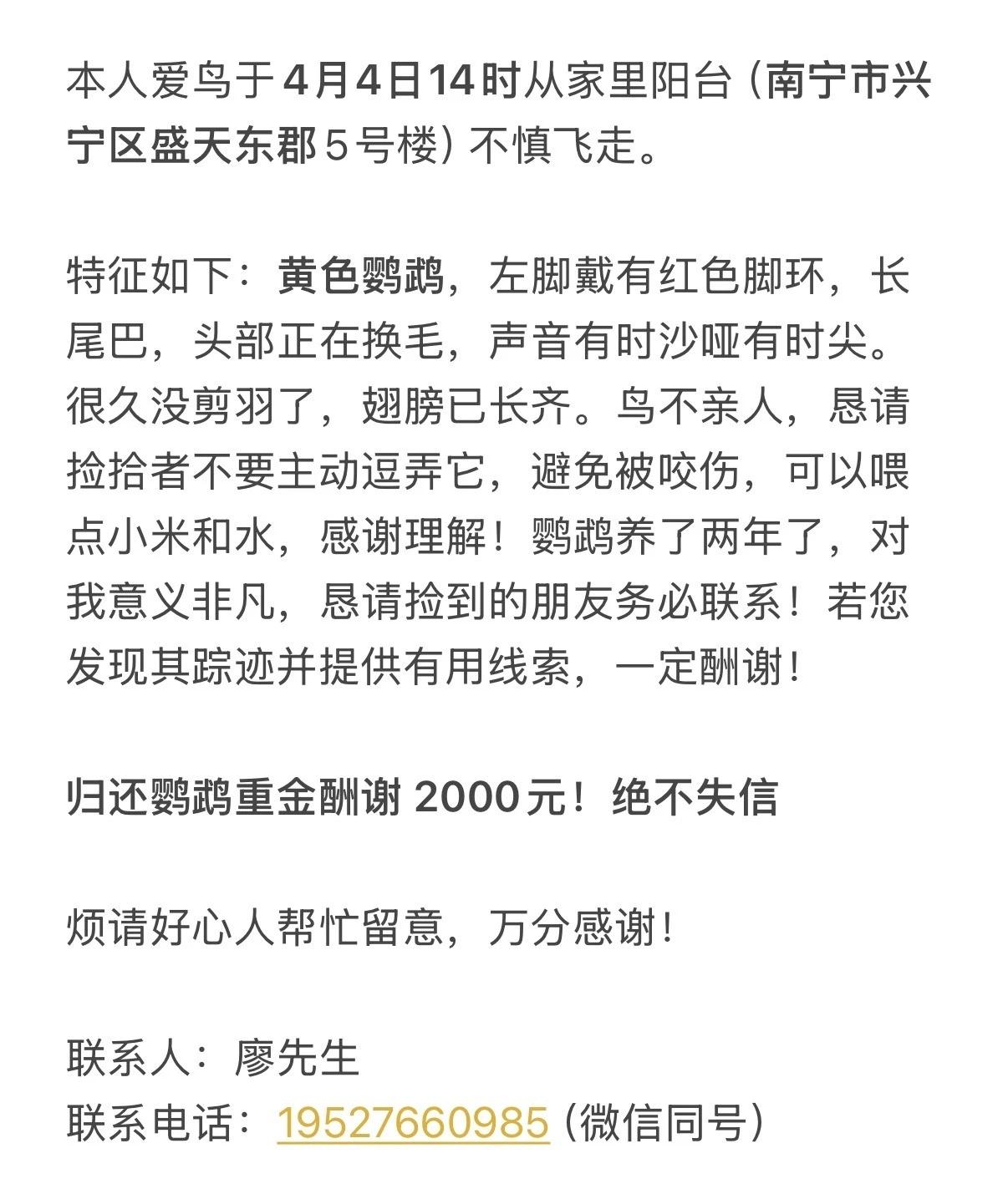 鹦鹉飞走的第二天! 昨天找了一下午都没在小区里听到叫声 今天也差不多 是飞到哪位好心人家里了吗😫 有看到的烦请告知谢谢 鹦鹉寻鸟启示 宠物寻主 谁家鸟丢了 寻鸟主人南宁