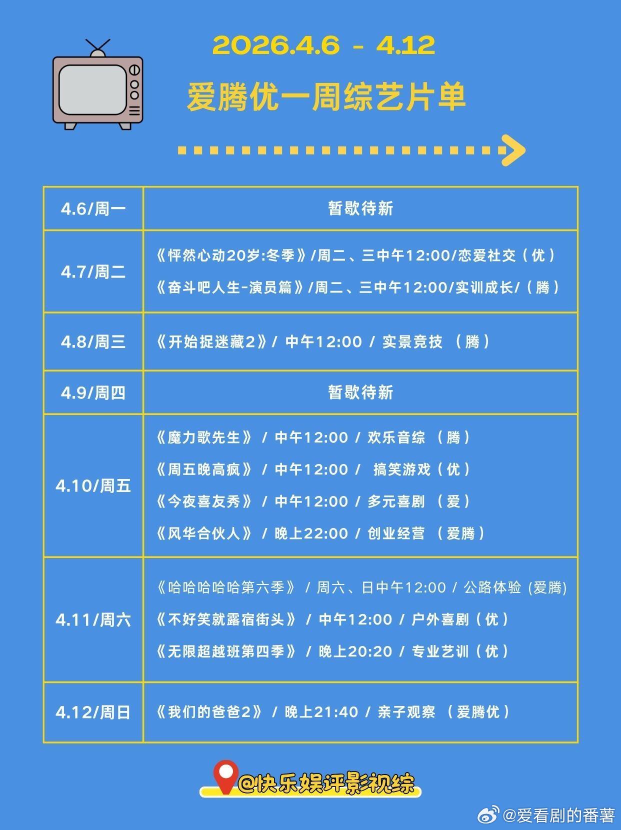本周爱腾优综艺 | 哪部值得追?看这张就够整理了 4.6-4.12 爱腾优本周综艺片单,帮你省掉刷首页的时间,直接按表追更👇✅ 恋综 / 实训:《怦然心动 20 岁:冬季篇》《奋斗吧人生 - 演员篇》✅ 实景竞技:《开始捉迷藏 2》✅ 周五快乐档:《魔力歌先生》《周五晚高疯》《今夜喜友秀》《风华合伙人》✅ 周末下饭:《哈哈哈哈哈 6》《不好笑就露宿街头》《无限超越班 4》《我们的爸爸 2》⚠️重磅预告:《奔跑吧第十季》本月24日集结再出发,敬请期待!