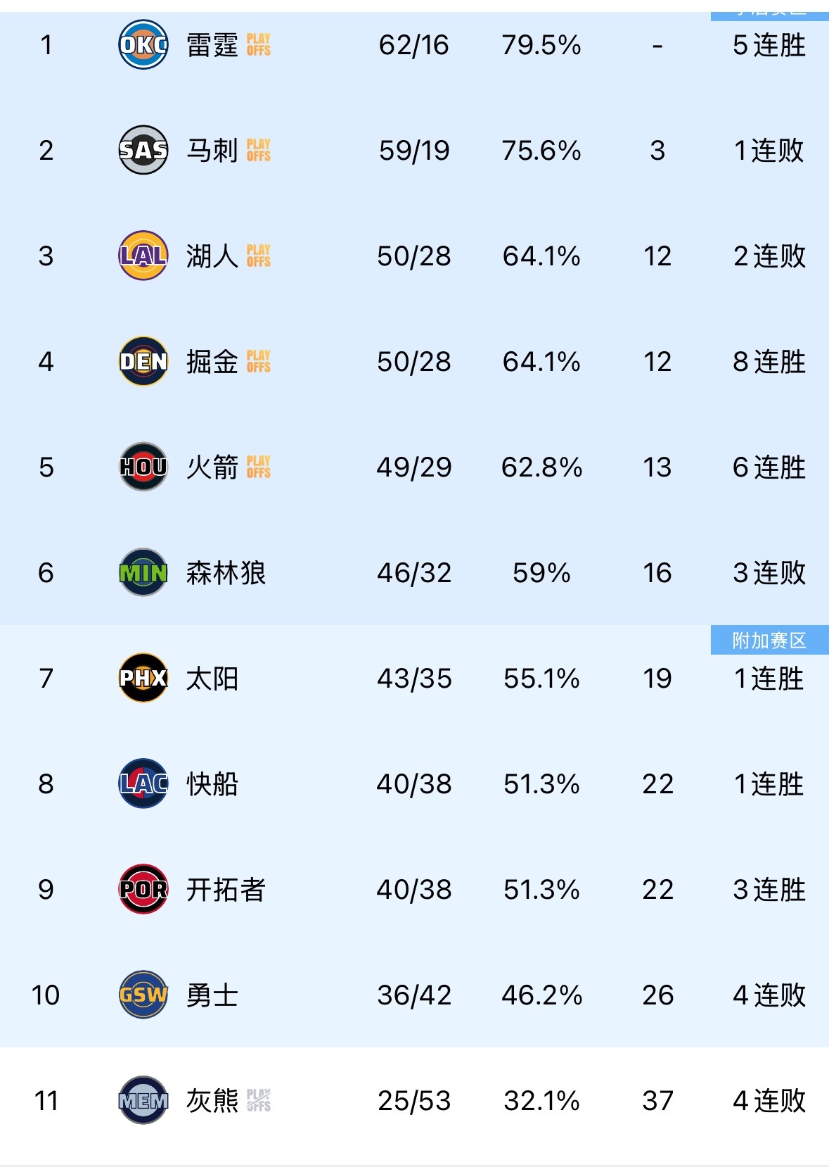 目前西部排名 雷霆马刺西部前二稳稳的火箭掘金森林狼都想首轮碰湖人了 勇士确定附加赛要打两场了 也都是客场 这三支球队能赢两支球队很难很难