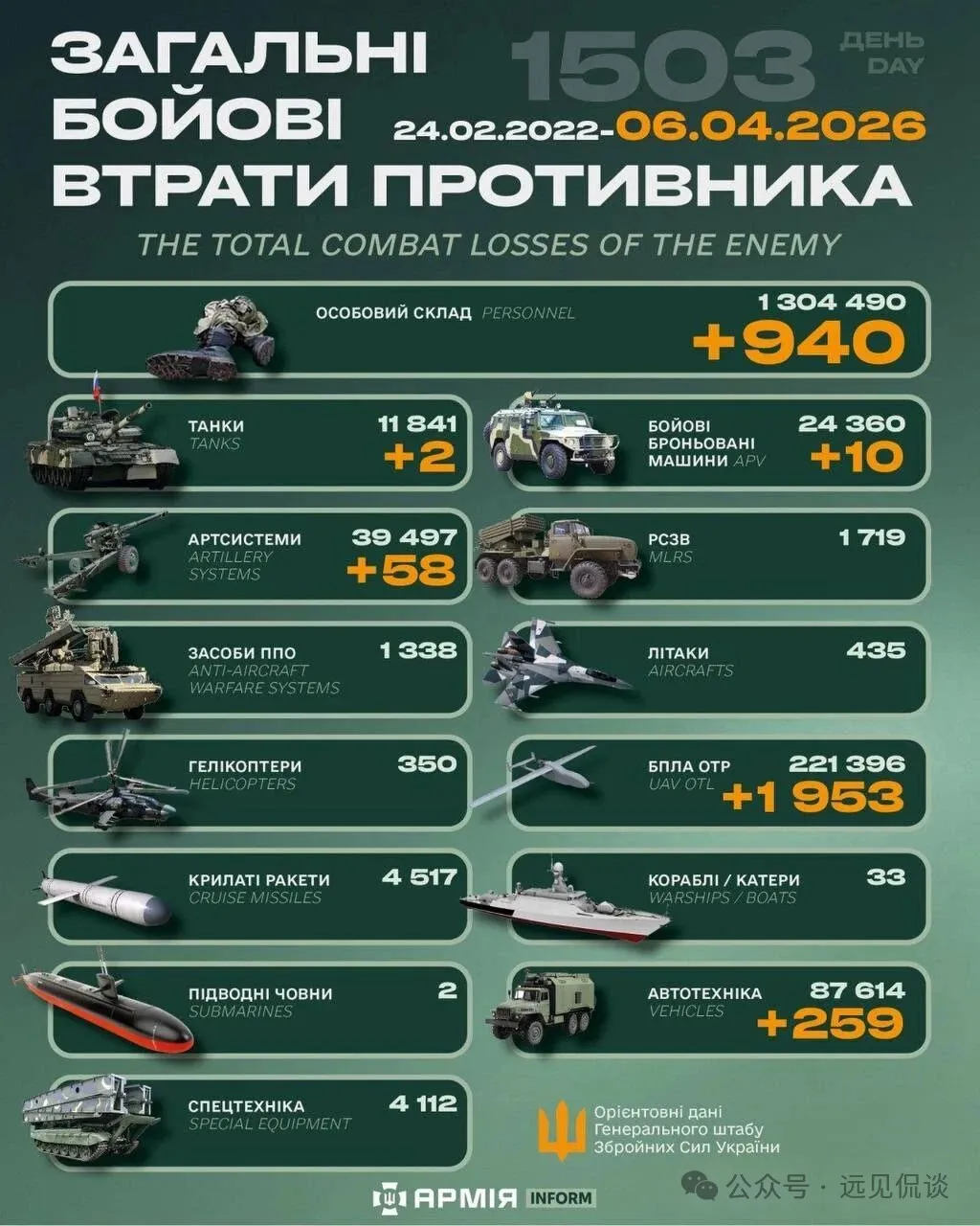 俄乌战争爆发第1503天。据乌军总参谋部消息,昨天,俄军伤亡940人,累计伤亡1304490人。