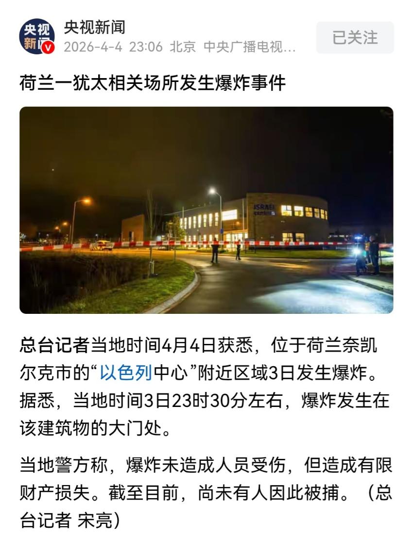 全球反犹行动只会愈演愈烈,而不会越来越小! 最新消息,荷兰奈凯尔克市的以色列中心发生了爆炸,这是一所专门用来宣传犹太文化,以及犹太人组织活动的场所,在当地时间 3 号深夜 11:30 的时候,突然发生了爆炸。 住在中心附近的居民说,当时正准备睡觉,突然听到一声巨响,震得窗户都在晃,出门一看,只见以色列中心的大门处火光冲天,浓烟滚滚,空气中弥漫着刺鼻的火药味和焦糊味。 警方在 11 点 32 分就接到了报警,赶到时发现大门已经被炸得严重变形,金属门框扭曲成了奇怪的形状,地上散落着玻璃碎片和爆炸残留物。 这处中心其实是当地 基督徒支持以色列 组织的总部,平时经常举办犹太文化讲座、以色列历史展览,还有犹太节日庆祝活动,是当地犹太社群和支持者的重要聚会点。 警方封锁了现场,排爆小组和法医都来了,连夜展开调查,可直到现在也没抓到嫌疑人,袭击动机还在排查中。 这起爆炸可不是孤立事件,最近全球针对犹太相关场所的袭击简直像开了闸一样停不下来。 就在爆炸前一天,加拿大多伦多一家犹太餐厅凌晨 1 点半左右遭到枪击,餐厅门窗被打得全是弹孔,好在当时店里已经打烊,没人受伤。警方查看监控,看到一名男子穿过马路,对着餐厅连续射击,随后迅速逃离现场,目前已经将此案定性为反犹仇恨犯罪。 再往前推几天,美国密歇根州西布卢姆菲尔德镇的犹太教堂也遭了殃,一名 41 岁男子在卡车上装满烟花,直接驾车冲撞这座当地最大的犹太教堂,还开枪射击。 FBI 调查后确认,这起袭击是受黎巴嫩真主党启发的恐怖行为,嫌疑人明确表示就是冲着犹太社群来的。 欧洲这边更是重灾区,3 月 9 日,比利时列日市一座百年犹太教堂突发爆炸,外墙被炸出一个大洞,内部的宗教用品损毁严重,警方当场就定性为恐怖主义袭击。 3 月 13 日,荷兰鹿特丹一座犹太教堂先是发生爆炸,接着又被人纵火,整个建筑都被浓烟熏黑。 3 月 23 日凌晨,英国伦敦北部的犹太社区也没能幸免,四辆用于紧急医疗救助的志愿救护车被人故意点燃,烧成了空壳,一个叫 正义人民伊斯兰运动 的伊朗支持组织还在社交平台上认领了这起袭击。 数据更能说明问题,美以联合发起针对伊朗的军事行动后,美国反犹事件激增了 344%,创 50 年来最高纪录,欧洲各地 3 月份的袭击事件也暴涨了 50% 到 280%。 这些袭击不再是零散的个人行为,而是呈现出组织化、网络化的趋势,很多新兴极端组织通过 Telegram 等平台串联,专门挑选犹太教堂、社区中心、学校甚至救护车这些核心目标下手。 更让人担忧的是,这些袭击已经从单纯针对犹太机构,扩散到了支持以色列的非犹太组织,就像荷兰奈凯尔克的这个以色列中心,明明是基督教组织运营的,却也成了攻击目标。 随着巴以冲突持续升级,美伊关系日益紧张,这种仇恨情绪还在不断蔓延,社交媒体上的极端言论更是推波助澜,让越来越多原本中立的人被卷入其中。 种种迹象都在表明,全球反犹行动的势头根本没有减弱的迹象,反而在不断扩大范围、升级手段。 只要中东的战火不停,只要仇恨的种子还在传播,这些针对犹太社群的攻击就只会愈演愈烈,成为困扰全球的一大难题。 本文内容皆为个人看法,如有更好的见解欢迎在评论区留言讨论。