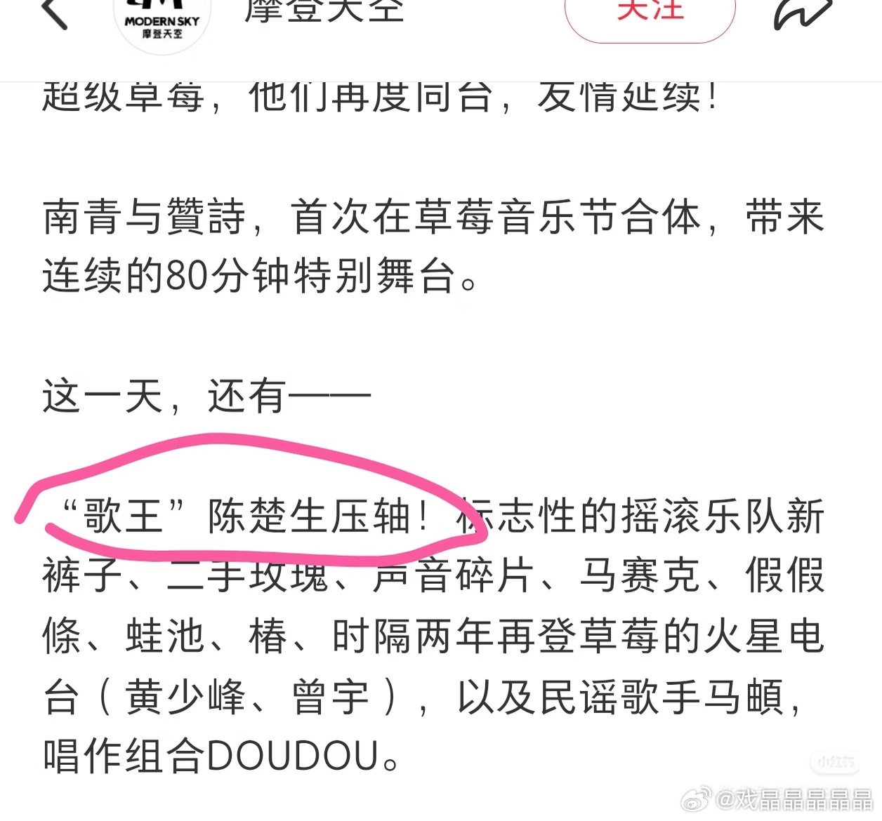 北京草莓音乐节2026第一天(5月2日),“歌王”陈楚生压轴。