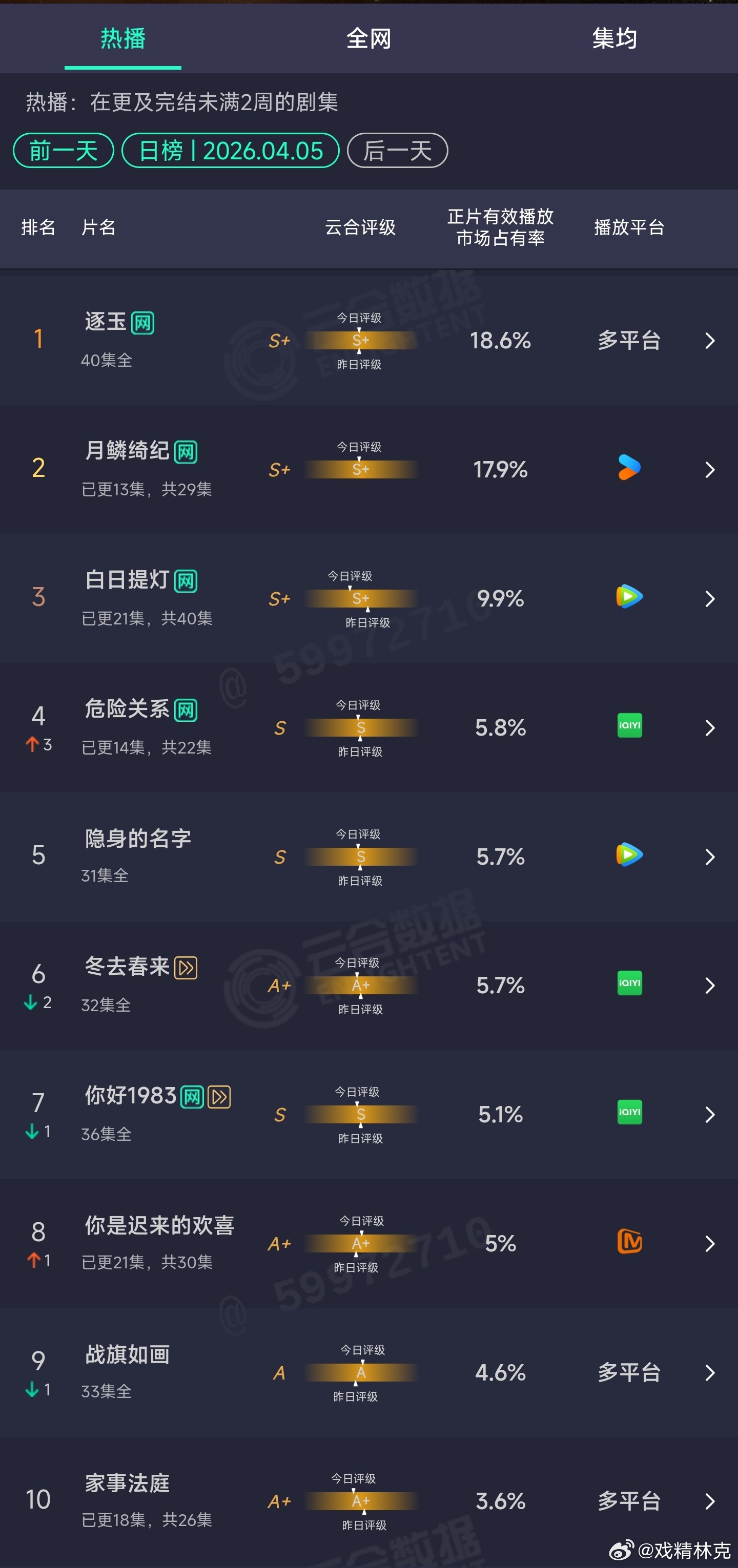 4.05云合:逐玉18.6%月鳞绮纪17.9%白日提灯9.9%