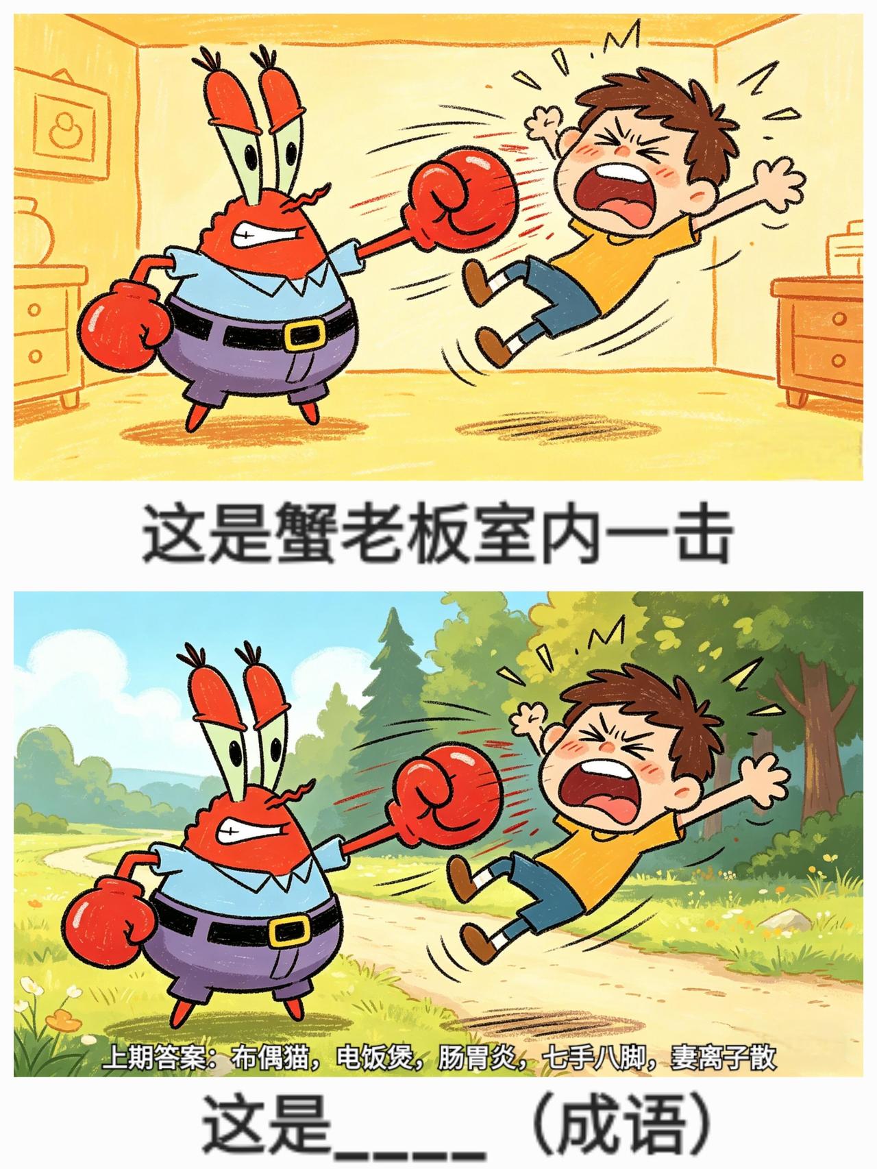 抽象谐音梗(209) 宝子们!这一组谐音梗我自己都笑晕了😂 本来只是随手制作的脑洞小漫画,没想到评论区全是大神! 特别是最后那张蟹老板的「又室外一击」,我自己画的时候都没想到答案这么绝! 全部都是轻松好猜的,不会太难,放心看~ 上期答案我也放在最后啦,方便大家对照~ 你们觉得哪一张最好笑?快来评论区Battle! 冷笑话 漫画 莫名其妙击中笑点 离谱但合理 奇怪的知识增加了 脑筋急转弯