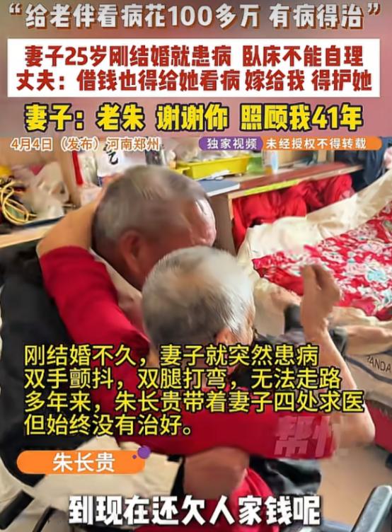 一日夫妻百日恩!河南郑州,大爷坚持照顾瘫痪的妻子41年,花费100多万为她治病,即使欠下高额债务,也毫无怨言。大爷说:她嫁给我,我就该一辈子对她好,不离不弃! 这事要从41年前说起,当时25岁的朱长贵刚和李巧妞喜结连理,小两口满心憧憬着未来,商量着好好打拼、生儿育女。可命运的变故毫无征兆,婚后不久,妻子突然浑身发抖,连一碗水都端不稳,更别说下地干活。 朱长贵慌了神,赶紧带妻子去医院,诊断结果像一盆冷水——妻子患上了难以治愈的帕金森综合征。医生说,这种病很难根治,只能靠长期药物维持和精心护理延缓恶化,后续费用更是天文数字,说不定要拖累一辈子。 那一刻,朱长贵感觉天塌了半截。他本是普通农民,家里没什么积蓄,刚结婚更是掏空了家底。 换成旁人,或许早就怨天尤人、打退堂鼓了,毕竟没人愿意被看不到希望的病人捆绑一生。可朱长贵一声没吭,擦干眼泪扛起了家的重担,在他心里,妻子既然嫁了自己,就无论怎样都不能丢下,有病就治、有难就扛,这是良心,更是丈夫的责任。 从那以后,朱长贵带着妻子踏上了漫长的寻医路,跑遍了大半个中国,只要有一丝希望,再远再贵也从未放弃。那时候万元户都稀罕,为了治病,他花光所有积蓄,还四处向亲戚朋友借钱,债务越积越多。有人劝他放手,找个健康的人过日子,他却笑着摇头:“钱没了可以再挣,人没了,我挣给谁看?她嫁给我一场,我不能对不起她。” 41年来,朱长贵从没睡过一个完整觉。医生叮嘱,妻子常年卧床,每两个小时就要翻身、按摩,否则容易长褥疮、肌肉萎缩,而且妻子夜里常会突然抽搐,需要及时照料。 他每天夜里定好闹钟,闹钟一响就立刻起身,轻手轻脚查看妻子状态,翻身、按摩、喂水喂药,遇上妻子大小便失禁,也毫无怨言地清洗、更换衣物,一套流程下来就要折腾半个多小时,刚躺下眯一会儿,闹钟就又响了。 常年的劳累让朱长贵浑身是病,关节不适、浑身酸痛,走路都有些蹒跚,可他从没喊过苦累。白天他更是忙得脚不沾地,天不亮就起床照料妻子洗漱、喂饭喂药,收拾完家里,还要出门打零工、干农活挣钱买药还债。 他出门有个铁规矩,从来不敢超过20分钟,买个菜都是一路小跑,朋友喊他喝酒,坐不到十分钟就急着往家赶,面对朋友的笑话,他只嘿嘿一笑:“这根绳子,我愿意拴一辈子。” 这份坚守从一开始就布满荆棘,最难熬的是头几年。妻子病情不断恶化,看着自己拖累丈夫,心里愧疚不已,不止一次哭着提离婚,甚至摔东西、撕结婚证,央求朱长贵让自己“解脱”,不想再拖累他。 每次听到这些话,朱长贵都装作没听见,依旧悉心照料,心里却比谁都难受。有一回,妻子又坚决提离婚,朱长贵红着眼眶吼道:“你再提离婚,我就跟你急!嫁给我就是我的人,这辈子赖也得赖在我身边,我不会丢下你的!”吼完,夫妻俩抱头痛哭,那以后,妻子再也没提过离婚,只是偶尔看着他忙碌的背影悄悄抹泪。 41年下来,朱长贵为妻子治病花了超过一百万,这对普通农民来说无疑是天文数字。他一辈子省吃俭用,穿洗得发白的旧衣服,吃最简单的粗茶淡饭,烟酒不沾,把所有收入和心思都放在妻子身上。农忙时,他天不亮就戴头灯下地,安排好妻子后再回去接着干,一天累得腰都直不起来,可只要看到妻子的笑容,就觉得一切都值得。 朱长贵的事迹慢慢被人熟知,街坊邻居都赞他重情重义,社区还给他颁了“模范丈夫”奖状。后来他的故事传到网上,引发全网热议,有人被这份深情打动,也有人说他固执愚笨,可朱长贵从不在意,依旧日复一日照料妻子,他不懂什么争议,只知道守好妻子、守好家就够了。 如今,夫妻俩都过了花甲之年,妻子虽仍卧床不能自理,但在朱长贵的精心照料下,脸色红润、眼神清亮,从没生过褥疮。有时候,她会拉着朱长贵的手,轻声说:“这辈子,我嫁对人了。”朱长贵便会不好意思地挠挠头,转身去给她做爱吃的鸡蛋面。 朱长贵不懂大道理,也不会说情话,却用41年的坚守,践行着结婚时的承诺,把“责任”刻进了骨子里。他失去了财富、自由和安逸,却守住了良心、家庭和纯粹的真情。 现在很多年轻人动辄因小事离婚,把婚姻当儿戏,而朱长贵用一生告诉我们,真正的爱情是苦难中的不离不弃,真正的婚姻是柴米油盐里的责任与担当。他用粗糙的双手撑起妻子的天,用朴素的坚守温暖了岁月,也感动了无数人。 41年光阴,让青丝变白发、少年变沧桑;百万积蓄,本可让家庭富足,可朱长贵都给了妻子。有人问他后悔吗?他认真地说:“后悔?我只后悔没早点学会按摩,让她少遭点罪!” 就是这样一位普通河南大爷,用41年的不离不弃,诠释了“一日夫妻百日恩”的真谛,用一生坚守书写了最动人的夫妻深情。在这个浮躁的时代,他的坚守格外珍贵,也让我们重新相信,人间自有真情在,一份承诺,一生坚守,便是世间最动人的风景。