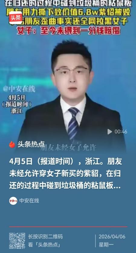 浙江,女子花了68,000元,买了一件紫貂,她连吊牌都还没有拆,自己还没舍得穿一次,朋友就偷偷把她的紫貂给穿了,女子发现后,让朋友脱下来,她双手去接,结果朋友把她的手按下去,说要去公厕脱下来,事后,她随意把紫貂放在沙发上,起来时,粘到了垃圾桶的粘鼠贴,她用力撕下,导致紫貂被毁,事后没有赔一分钱,还歪曲事实,拉黑女子。 事发当天,这位朋友来到李女士的活动场所,趁着李女士不注意,私自翻找衣柜,把这件全新的紫貂大衣穿在了身上。等李女士发现的时候,对方正穿着这件昂贵的衣服,毫无顾忌地在公共区域活动,丝毫没有询问过衣服主人的意愿。 李女士又气又急,当场就要求朋友把衣服脱下来。她心疼这件全新的衣服被随意穿着,生怕有一点磕碰和脏污,连忙伸出双手,想要稳稳接住朋友脱下来的大衣。 可让她怎么也没想到的是,朋友不仅没有丝毫愧疚,反而一把按住了她伸出去的手,语气理所当然地表示,要去公共厕所里再把衣服脱下来。 这个举动,让李女士当场愣在原地。一件全新的、价值近七万的皮草,对方不仅未经允许就私自穿上身,还要穿着它去环境复杂的公共厕所,丝毫没有考虑过这件衣服会不会被弄脏、被损坏。可即便心里万般不愿,她也没能拦住对方的脚步,只能眼睁睁看着朋友穿着自己的紫貂走进了公厕。 而这场噩梦,才刚刚开始。 等朋友从公厕出来后,没有小心翼翼地把衣服叠好归还,反而随手就把这件紫貂大衣搭在了旁边的沙发扶手上,全程没有和李女士说一句抱歉,仿佛只是随手放了一件不值钱的旧外套。 就是这个随意的动作,酿成了无法挽回的后果。沙发旁边的垃圾桶旁,恰好放着一张粘鼠板,朋友随手放下的大衣下摆,正好落在了粘鼠板上,强力的粘胶瞬间就和珍贵的貂皮毛紧紧粘在了一起。 发现衣服被粘住后,这位朋友的操作更是让所有人都大跌眼镜。她既没有第一时间告知李女士,也没有寻找专业的方式处理,反而直接蹲下身,抓着衣服用力撕扯。 随着刺啦一声响,粘胶连着貂毛被硬生生扯了下来,珍贵的皮草面料瞬间出现了大面积的破损,皮毛大片脱落,皮板也被扯得开裂变形。直到做完这一切,她才轻描淡写地和李女士说了一句,衣服被弄脏了。 等李女士接过这件大衣的时候,眼前的景象让她心都碎了。原本顺滑油亮的紫貂,如今多处皮毛脱落、面料开裂,粘胶残留的地方变得硬邦邦的,别说再穿出门,就连专业的皮草护理店都表示,这件衣服已经彻底损毁,几乎没有修复的可能。 自己连一次都没穿过的心头好,就这么被朋友毁得面目全非,李女士的愤怒和心痛可想而知。她找到这位朋友,要求对方为自己的行为负责,承担相应的赔偿责任。可对方的态度,却从一开始的满不在乎,变成了倒打一耙。 她不仅没有拿出一分钱的赔偿,反而在共同的好友圈里歪曲事实,把自己塑造成无辜的受害者,说李女士小题大做、斤斤计较,不过是一件衣服,就揪着她不放。 面对李女士的合理索赔,她更是直接翻脸,把李女士的微信、电话等所有社交联系方式,全部拉黑删除,彻底玩起了失联,甚至还甩出一句冰冷的 “有本事你拿律师来跟我对话”。 截至目前,李女士依旧没有拿到一分钱的赔偿,近七万元的损失只能自己默默承担。这件事被曝光后,迅速冲上各大平台的热搜,网友们的评论几乎一边倒地站在李女士这边。有网友说,这哪里是朋友,分明是把别人的珍视踩在脚下,既没有边界感,也没有责任心;也有网友表示,未经允许动别人的东西本就是大忌,弄坏了不赔偿还倒打一耙,这样的人趁早远离。 从法律层面来说,这位朋友的行为,早已触碰了法律的红线。根据《中华人民共和国民法典》第一千一百六十五条规定,行为人因过错侵害他人民事权益造成损害的,应当承担侵权责任。 这位朋友未经主人允许,私自穿着他人贵重衣物,后续又因不当操作导致衣物彻底损毁,主观上存在明显过错,客观上造成了他人的财产损失,依法应当承担全额的赔偿责任。 而这件事最让人唏嘘的,从来都不是一件紫貂大衣的损毁,而是一段友情在人性的考验面前,碎得彻彻底底。 我们总以为,朋友之间不必太过计较,可真正的友情,从来都不是肆无忌惮地越界,不是理所当然地索取,而是懂得尊重对方的边界,珍惜对方的珍视,犯错之后有直面的勇气,更有承担责任的担当。 一件近七万元的大衣,看清一个人的人品,代价固然惨痛,但也足够清醒。毕竟,钱没了可以再赚,可一个没有底线、没有担当的人,只会在未来的日子里,带来一次又一次的伤害。