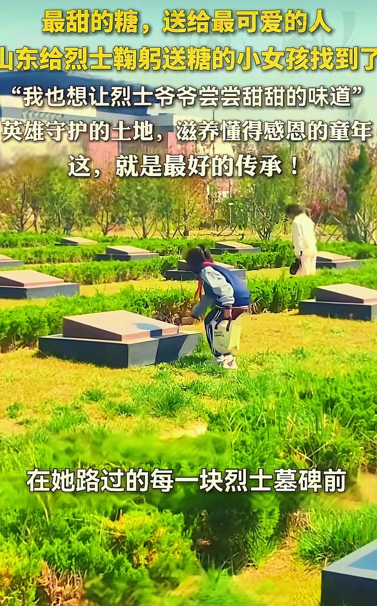 太暖心了!山东聊城10岁女孩,用两颗糖甜哭了无数人。 错过学校祭扫,她非要家人带自己去烈士陵园,别人献花献果,她却掏出自己最爱吃的高粱饴和椰子糖,一座墓碑一座墓碑地放,从南拜到北,每一座都认认真真鞠三个躬。 很多大人祭拜走的是流程,可孩子走的是心。她不懂什么宏大道理,只知道烈士爷爷们守护了我们,就想把自己最甜、最宝贝的东西分给他们。这不是形式,不是任务是最纯粹的感恩。 大人总把爱国挂在嘴边,可这个女孩用行动告诉我们,真正的传承从来不是口号。善良刻在骨子里,敬意藏在细节里,一颗小小的糖,分量比任何礼物都重。 这才是少年该有的模样,干净、真诚、懂感恩、有温度。