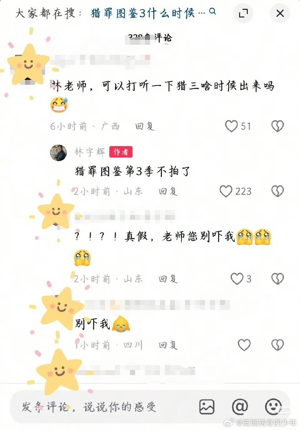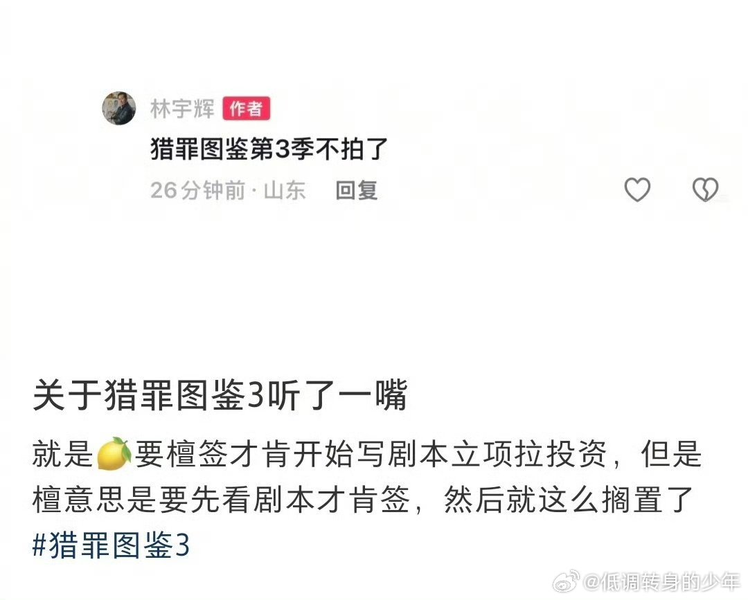 林宇辉 猎罪图鉴3不拍了林宇辉说猎罪图鉴第3季不拍了,没有了 !还是要看到全剧本再决定签不签啊第一季第二季创下的好口碑,第三季坚持内容质量为本,对自己负责也是对观众负责,檀健次对自己演的剧本负责,简直是人间清醒林宇辉 猎罪图鉴3不拍了