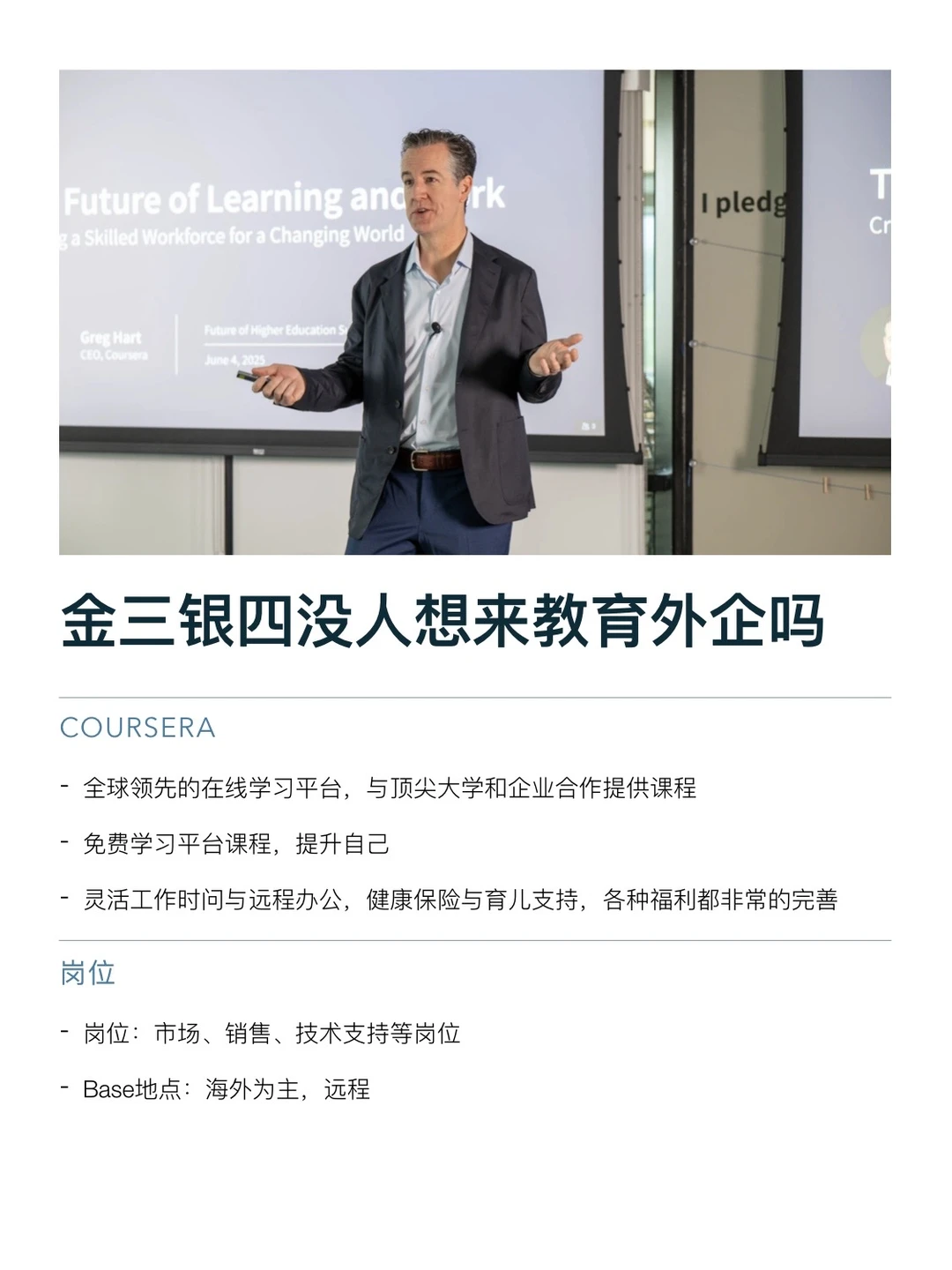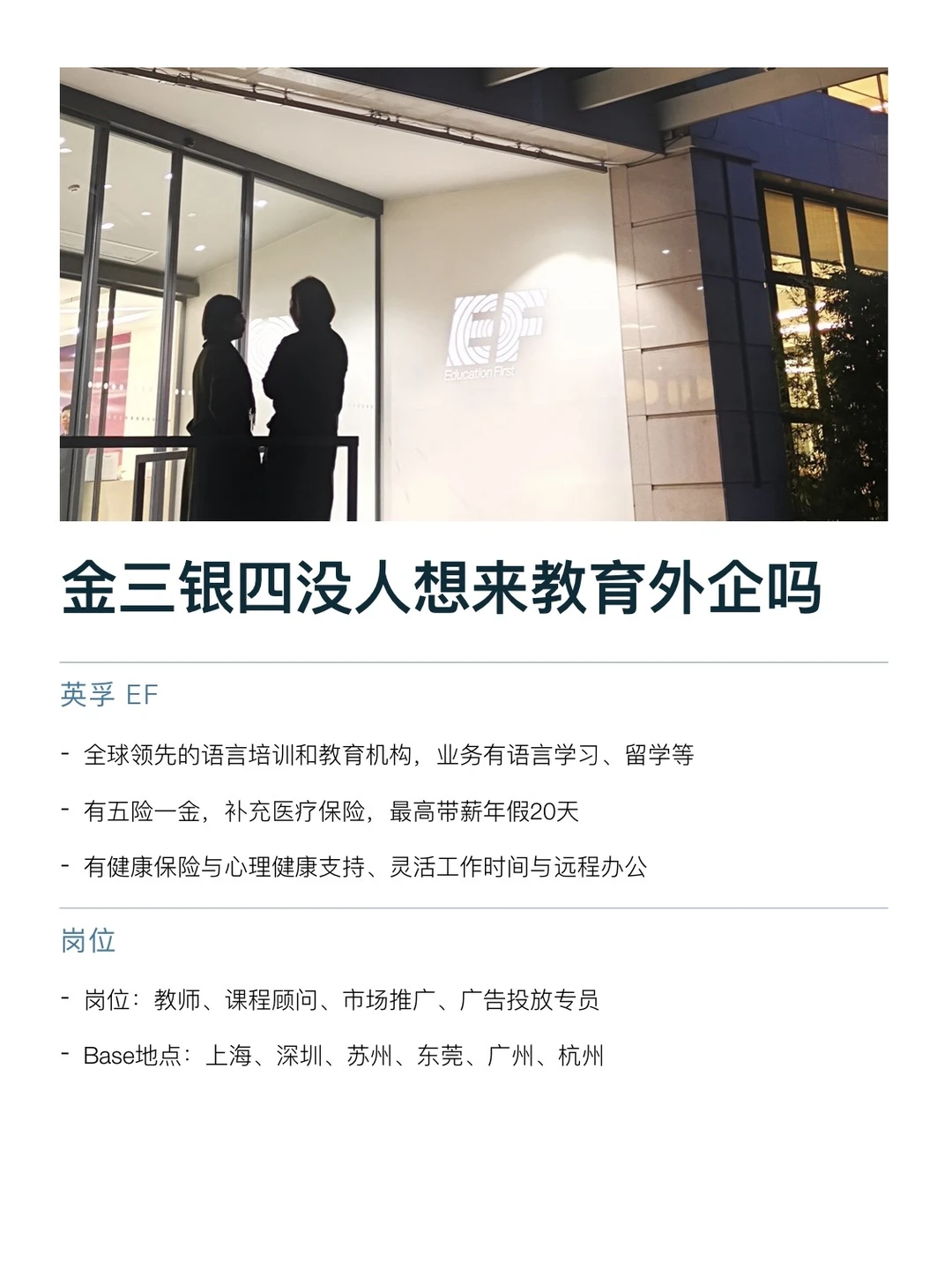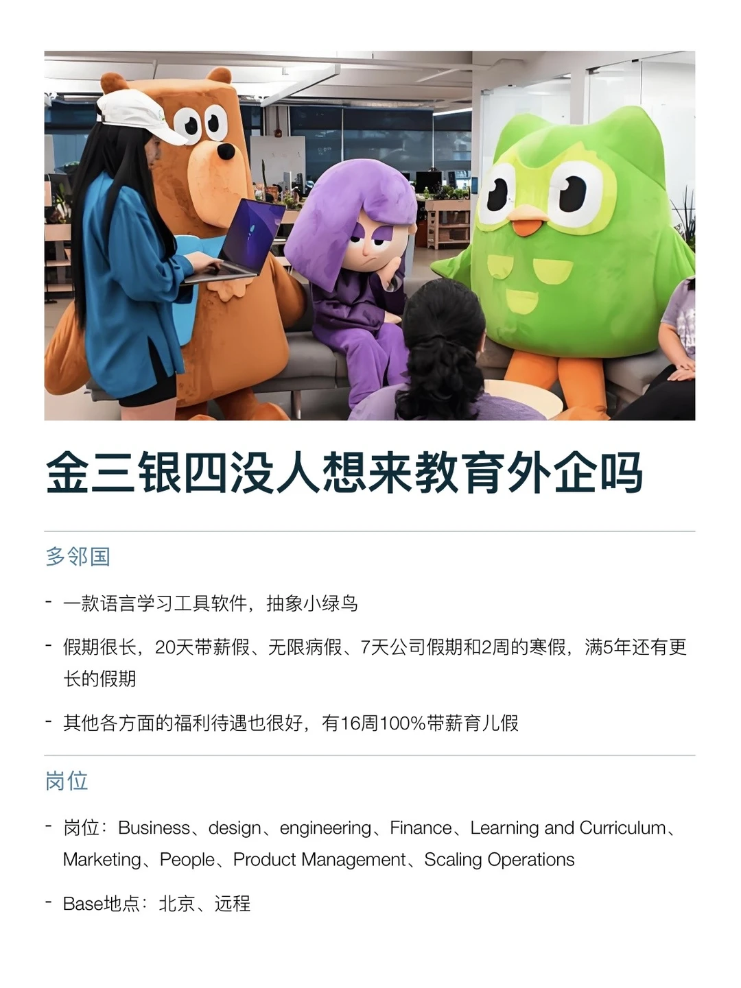 教育外企其实是个很香的赛道,不是传统培训机构那种,而是偏数字化、内容、平台、教辅方向的,比如说多邻国这种,还有一些大家可能没听过但也在做类似产品的 适合这些人👇🏻 - 本身做教育、内容、课程、产品 - 喜欢和知识、语言、内容打交道 - 语言能力不错、想在国际团队里成长 为什么说值得去,主要是对女性很友好,也不卷,基本上都是955、年假10–15天、还支持弹性办公或远程,工作体验感会更好一些 总之会比较适合喜欢内容、喜欢学习、想做有长期价值的事的人 坚持日更✊🏻,对外企感兴趣的欢迎常来看看