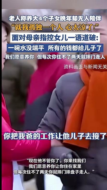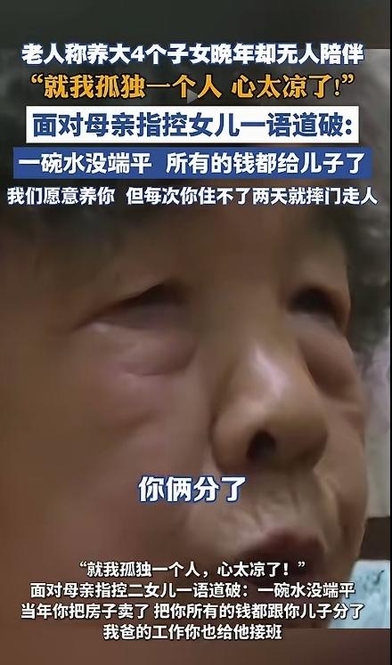 河南郑州一位81岁的老人,辛辛苦苦把4个子女拉扯大,1个儿子3个女儿,本以为养儿防老能安享晚年,结果呢?如今孤苦伶仃一个人,守着空荡荡的屋子,对着镜头哭着说:“就我孤独一个人,心太凉了!” 这话听着就让人心酸,可更让人愤怒的还在后面——面对母亲的哭诉,女儿直接一句话戳破真相,把这层遮羞布撕得稀碎! 女儿说,当年母亲根本就没一碗水端平,家里的房子卖了,所有的钱全给了儿子,就连父亲的工作,也让儿子接了班。 女儿们呢?从小吃苦受累,没捞着一点好处,可母亲老了、儿子不养了,就想起女儿来了。 女儿们也不是不孝顺,说愿意养她,让她住家里,可每次住不了两天,母亲就摔门走人、挑三拣四。 为啥?还不是因为心里偏私,住着女儿的房子,心里还惦记着儿子,总觉得女儿不如儿子亲,一点小事就闹得鸡飞狗跳。 到最后,儿子撒手不管,母亲哭天抢地,女儿们满腹委屈,好好一个家,被搅得支离破碎。 网友评论区吵翻了,全是大实话,有的网友说:这不就是典型的“惯子如杀子”吗?把所有好的都给儿子,把女儿当免费保姆,最后儿子啃老,女儿寒心,苦果只能自己咽! 也有的网友说:看哭了又气笑了,多少家庭都是这样!重男轻女的老观念,毁了多少亲子关系?一碗水没端平,别指望晚年能和睦! 还有的网友说:我也是当妈的,真替这些女儿不值!从小付出的心血不比儿子少,最后却成了“背锅侠”,老人不反思自己,还怪女儿们? 更有网友说:这就是人性啊!你把他宠上天,他觉得理所当然;你对他一般,他反而记着好。老人把儿子当宝,最后被宝抛弃,纯属自食其果! 说实话,看完这个事,我心里五味杂陈,既心疼这几个女儿,又觉得老人可怜又可恨。 可怜的是,一把年纪了,本该享清福,却落得孤独无依的下场;可恨的是,到了这个地步,还没意识到自己的问题,一辈子重男轻女,把子女的心伤透了。 女儿们有错吗?没有。她们愿意赡养母亲,已经仁至义尽了,可母亲总拿着“儿子才是根”的老思想挑刺,住两天就闹,换谁能受得了? 儿子呢?从小被宠坏了,觉得父母的付出都是应该的,母亲没人养了,也躲得干干净净,半点责任都不担。这就是偏心养出来的恶果——你把所有的爱、所有的资源都给了他,最后他却成了最凉薄的人。 多少家庭,都毁在这种“一碗水端不平”上?父母总觉得“儿子传宗接代最重要”,拼命偏心,却忘了子女都是心头肉,公平才是亲情的底色。 亲情从来不是靠偏袒维系的,而是靠真心换真心。你对孩子好,孩子才会对你亲;你公平对待每一个孩子,孩子才会真心孝顺你。 别总想着靠儿子养老,也别总忽视女儿的付出,人心都是肉长的,你偏心一次,孩子就记恨一次,最后伤的是自己,毁的是整个家。 偏心养不出孝顺,公平才换得来真心;一碗水端不平,晚年注定一场空! 信息来源:海报新闻