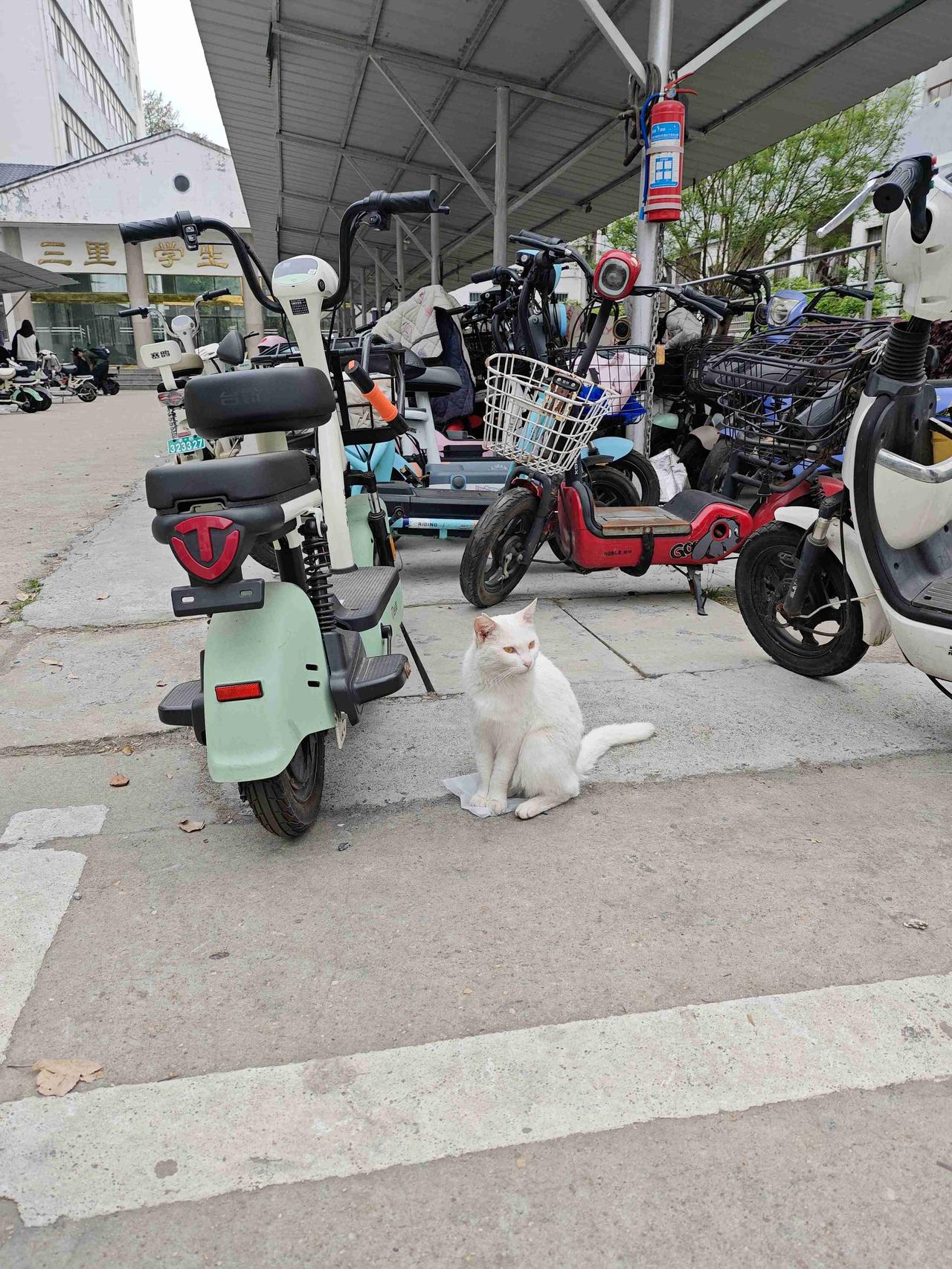 我的今日状态:😎自信酷炫 我这里的天气:🍂微风 车棚旁,一只通体雪白的猫咪正安静蹲坐。金瞳澄澈,粉鼻粉嫩,周遭电动车林立,它像独立静处,清冷又治愈。
