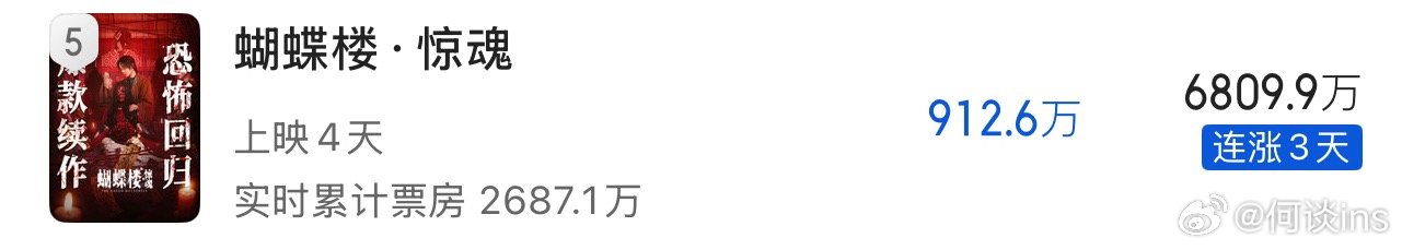 恐怖片还是很猛的,《蝴蝶楼·惊魂》空降定档清明,预测票房已经到7000万了,离五一还有一个月,能往过亿冲一下
