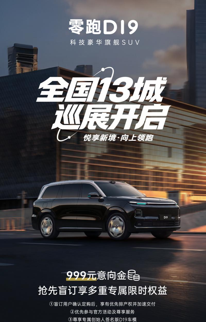 D19-零跑D19盲订开启!999元抢先锁定旗舰SUV,全系车型同步推出限时福利 零跑D19正式开启盲订,999元意向金即可提前锁定这台全尺寸旗舰SUV。与此同时,零跑全系车型也同步推出限时购车福利,具体权益可登录官方APP或咨询门店。 作为零跑十年技术积累的旗舰之作,D19车长超5米2、轴距超3米1,设计上采用“科技自然美学2.0”,纯平侧窗、拼色车顶等细节让整车气场十足。 技术层面亮点不少:增程版搭载全球首创80.3度大电池,纯电续航超500公里,并首搭CTC电池底盘一体化技术;纯电版首发115kWh超级混合电芯,兼顾能量密度、安全性与寿命。智能方面,首发双SA8797中央域控,支持车位到车位辅助驾驶和端侧大模型座舱,车机系统可本地化学习用户习惯,响应快且保护隐私。 驾控配置也很硬核:双腔闭式空悬、CDC减振、前双叉臂后五连杆悬架,配合LMC 2.0底盘系统,可实现双轮爆胎稳定控制和3.6米级圆规掉头。舒适性上,行业首创车规级制氧机,支持弥散式和鼻吸式两种模式,长途或高原出行很实用。 盲订政策:即日起至D19上市前,通过零跑官方APP、小程序或官网支付999元意向金,确认定购后可享优先排产和加速交付。前2000名最终提车的用户,还能获创始人签名版D19车模。盲订订单在确认定购期内随时可退,未在期限内定购则自动取消。 在新势力阵营中,零跑汽车继续领先,3月全系交付50029台,再次突破月销五万大关,全系在4月份也开展了限时福利:零跑C系列、B系列、T03等车型同步推出金融贴息、置换补贴、选装包折扣等多重权益,详情可以去线下门店具体了解。 D19定位30万级全尺寸旗舰SUV,目标务实中产大家庭和技术派新中产。这台车能否成为市场新选择?值得关注。