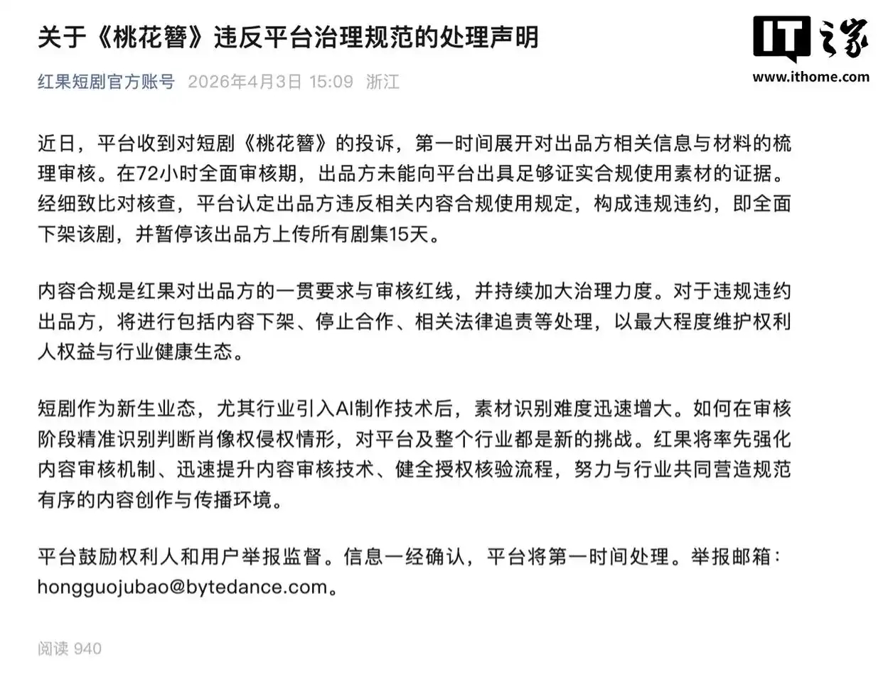 不仅如此,红果短剧官方更是发布《关于持续治理AI短剧素材违规使用行为的公告》,对今年一季度持续治短剧作品,尤其是AI短剧:平台已累计下架违反平台治理规范的漫剧1718部,其中针对AI短剧的合规治理,目前已完成1.5万部作品的全面核查,依规处置违规作品670部。