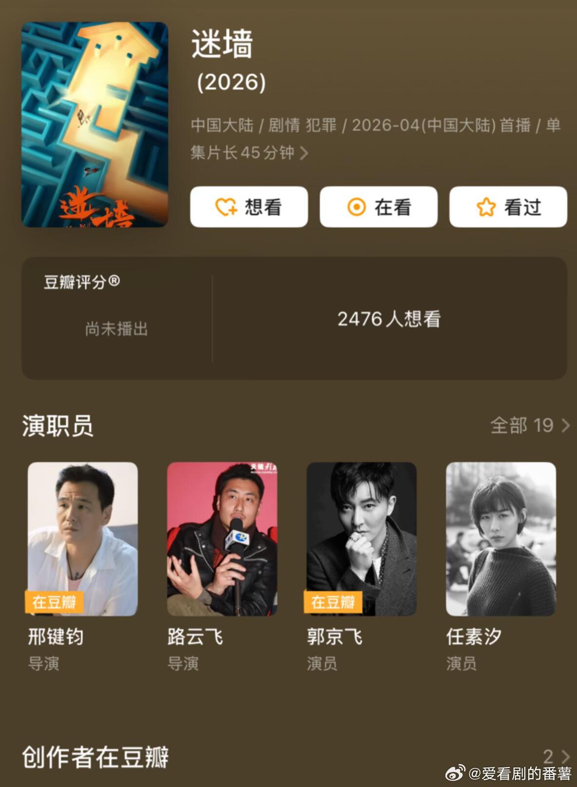 《方圆八百米》p2-p3暂定🐧2026年4月10日/4月17日开播❗️丁勇岱✖️许凯✖️邓恩熙胡可 涂松岩 曲栅栅 赵麒 何奉天 苏鑫j察父亲❌犯z儿子/矿区青年❌儿子女友年代案件+父子较量+陈年旧事+情法博弈《花好》p4-p5双平台暂定湖南+🥭2026年4月中旬开播❗️周依然✖️王子奇(双强cp)徐梦洁 王梓豪 涂松岩 李依晓 是安 董思怡心理咨询师❌精英律师现代爱情+欢喜冤家+职场交锋+共同成长《千香引》/《千香》p6-p7暂定👖2026年4月11日/4月22日/4-5月开播❗️宋威龙✖️鞠婧祎 (二搭)赵华为 刘梦芮 张志浩 朱丽岚 叶盛佳 郑合惠子神秘少年❌青丘孤女古装仙侠+奇幻爱情+身世之谜+对抗宿命《惊变》p8-p9双平台:暂定央一+🥝2026年4月中旬开播❗️于和伟✖️辛柏青✖️富大龙✖️曹师琨曹磊 章申 朱宏嘉 许金言 刘妍 张思潼中g情报员 VS 反派特w头子反特谍z+真实事件+两个单元+生s博弈《蜜语纪》p10-p11双平台:暂定🐧+🥝2026年4月30日/5月初开播❗️钟汉良✖️朱珠✖️李梦✖️经超任彬 徐海乔 郭晓婷 高卿尘 海陆 那家威酒店经理人/新任总经理❌饭店客房保洁现代爱情+都市生活+熟龄男女+职场成长《迷墙》p12-p14暂定🐧2026年4月底/5月开播❗️郭京飞✖️任素汐(二搭)谷嘉诚 漆昱辰 温峥嵘 刘天佐 迟蓬 方芳人物故事+轻喜风格+中年夫妻+荒诞暴富《悬案》p15-p16暂定👖2026年4月底/5月开播❗️岳云鹏✖️杨烁江奇霖 郎月婷 黄觉 王传君 姜冠南 曾美慧孜刑侦破案+悬疑z案+两个单元+真实事件