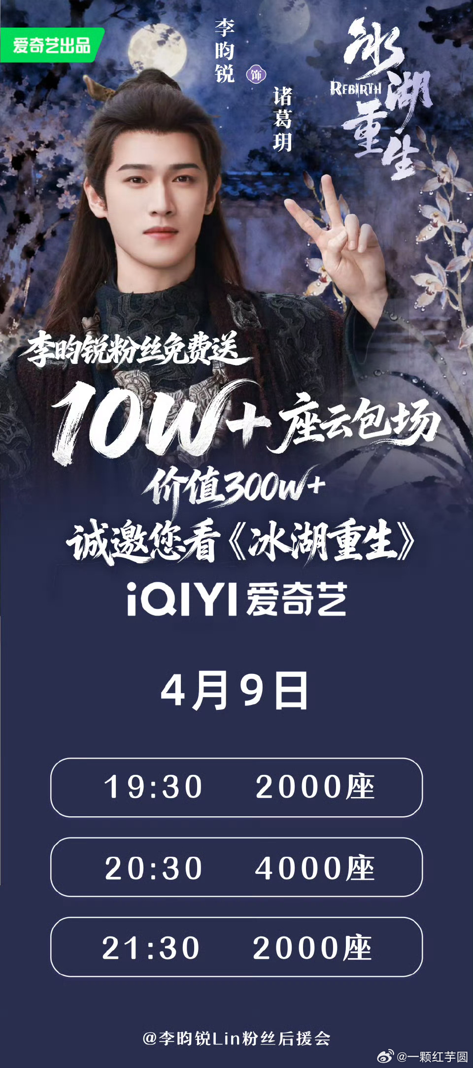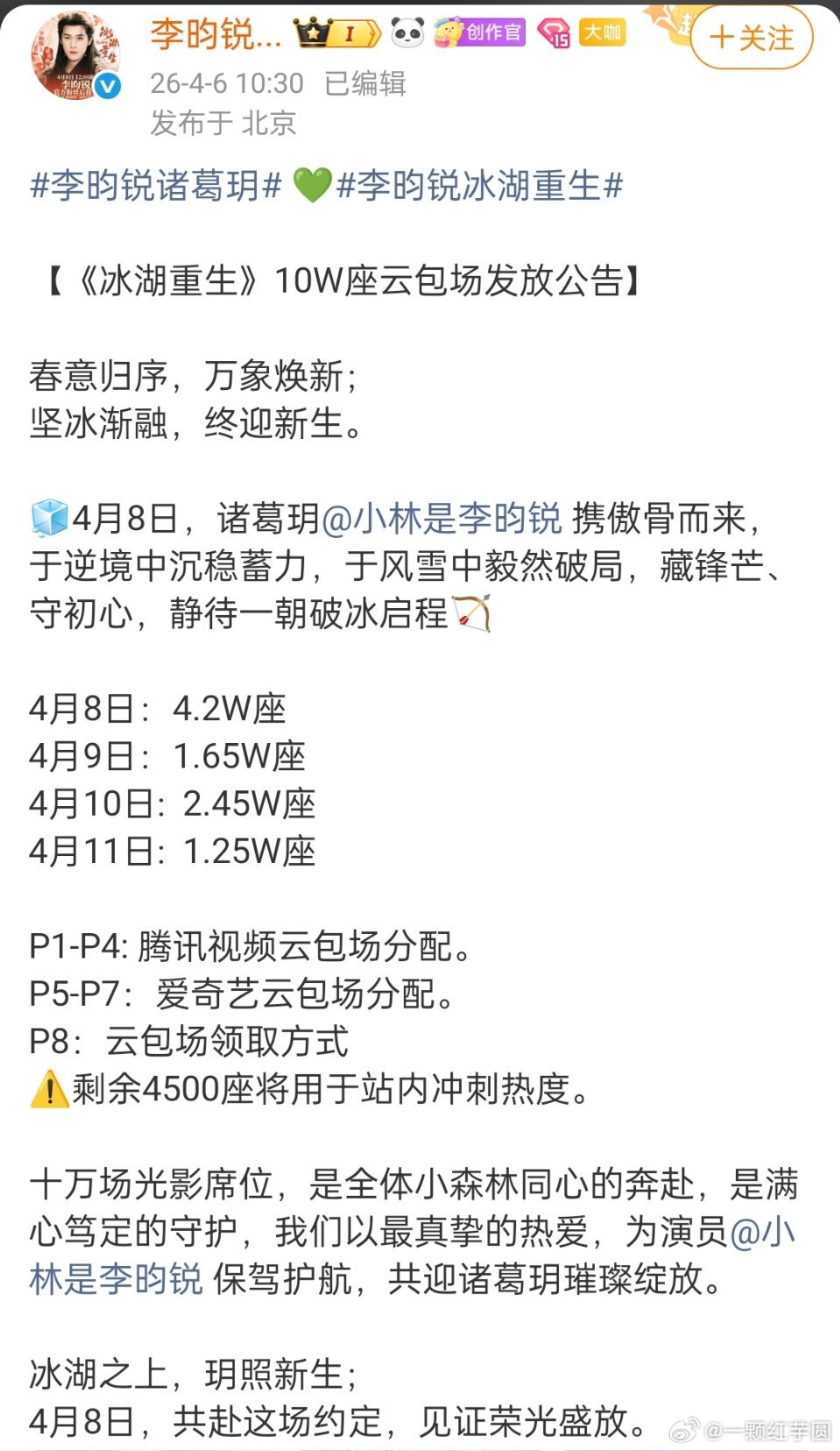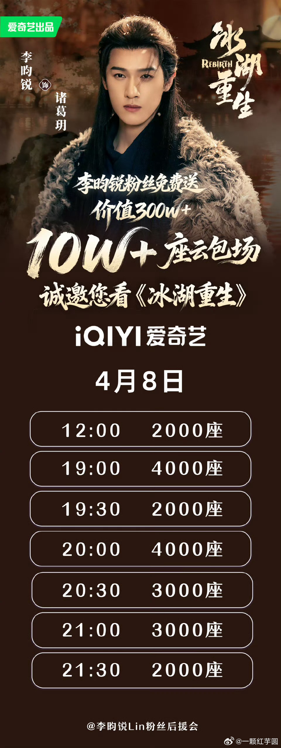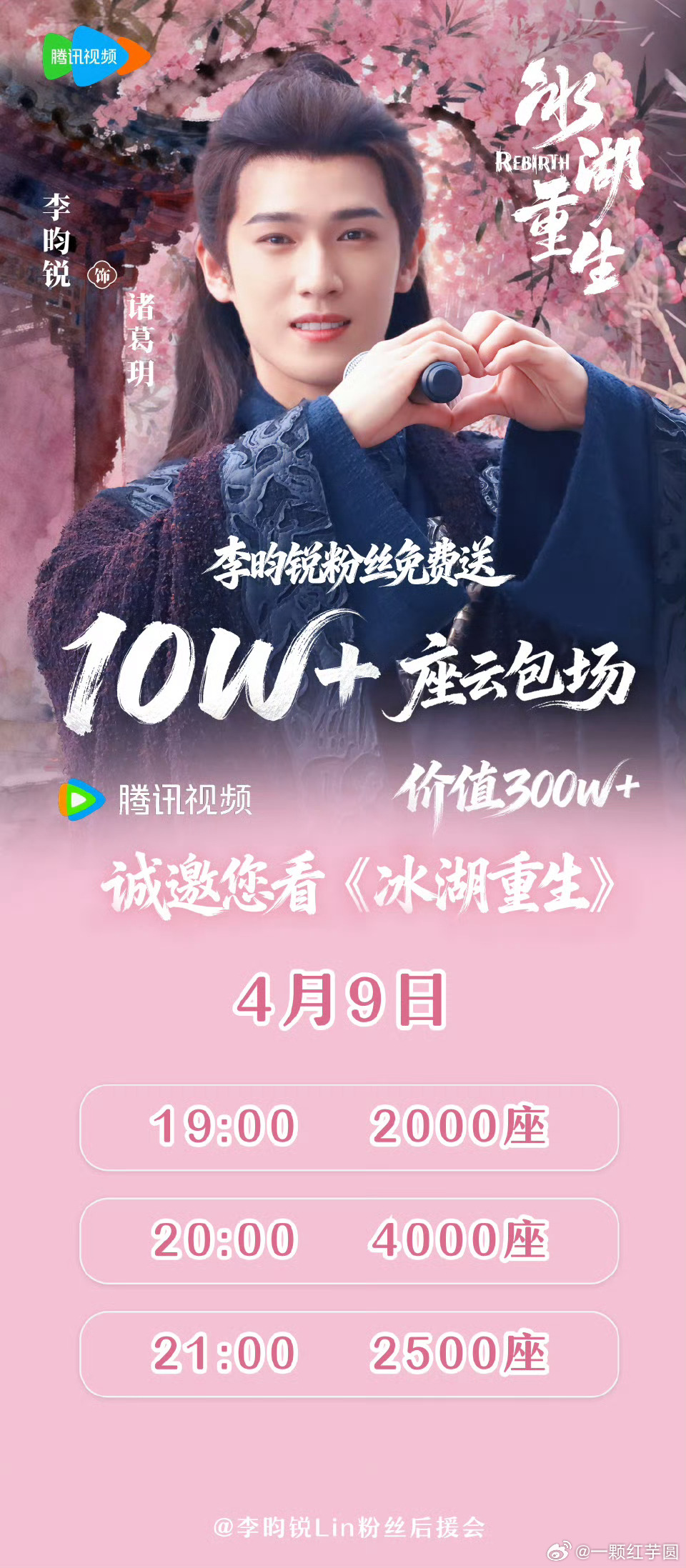 李昀锐 粉丝为冰湖重生准备了10w云包场!4月8-11号,连续四天🥝🐧都有!