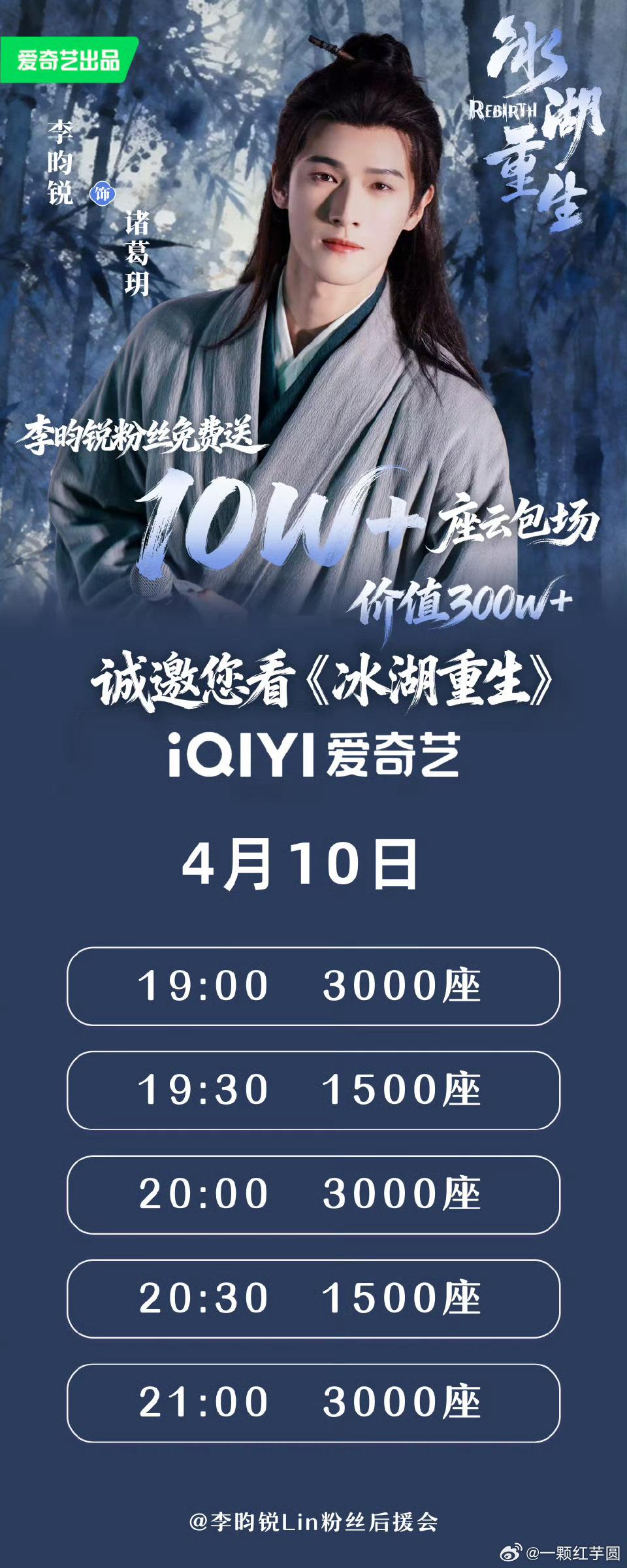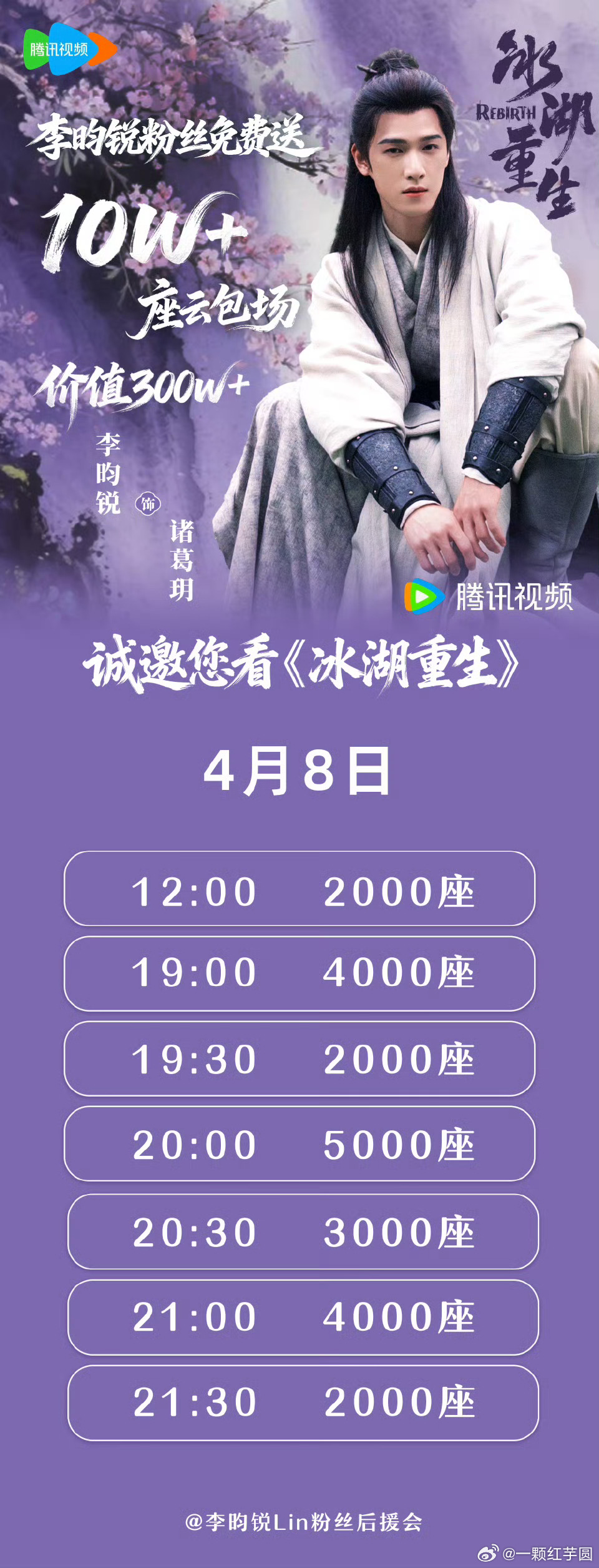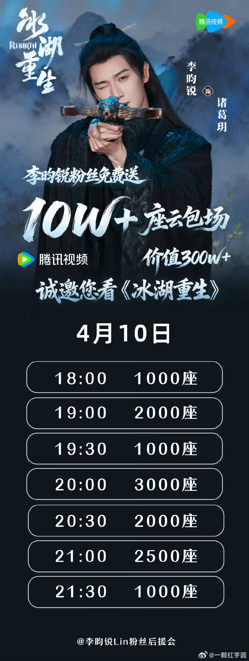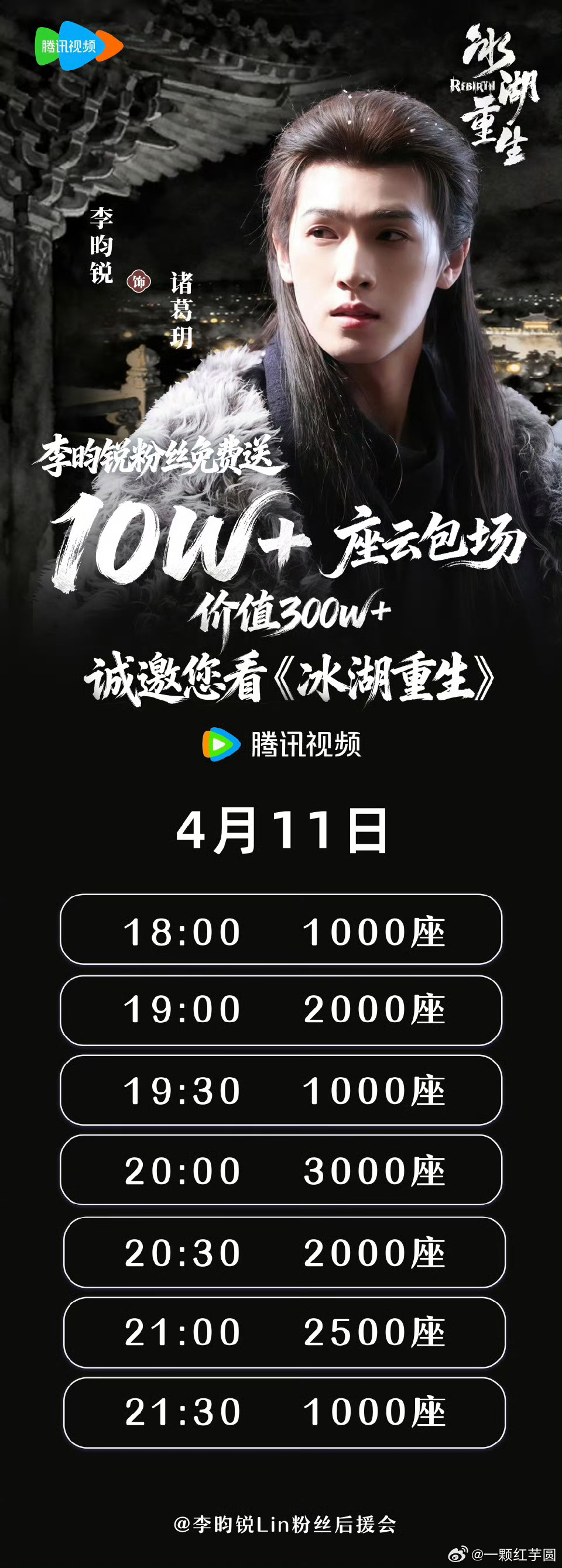 李昀锐 粉丝为冰湖重生准备了10w云包场!4月8-11号,连续四天🥝🐧都有!