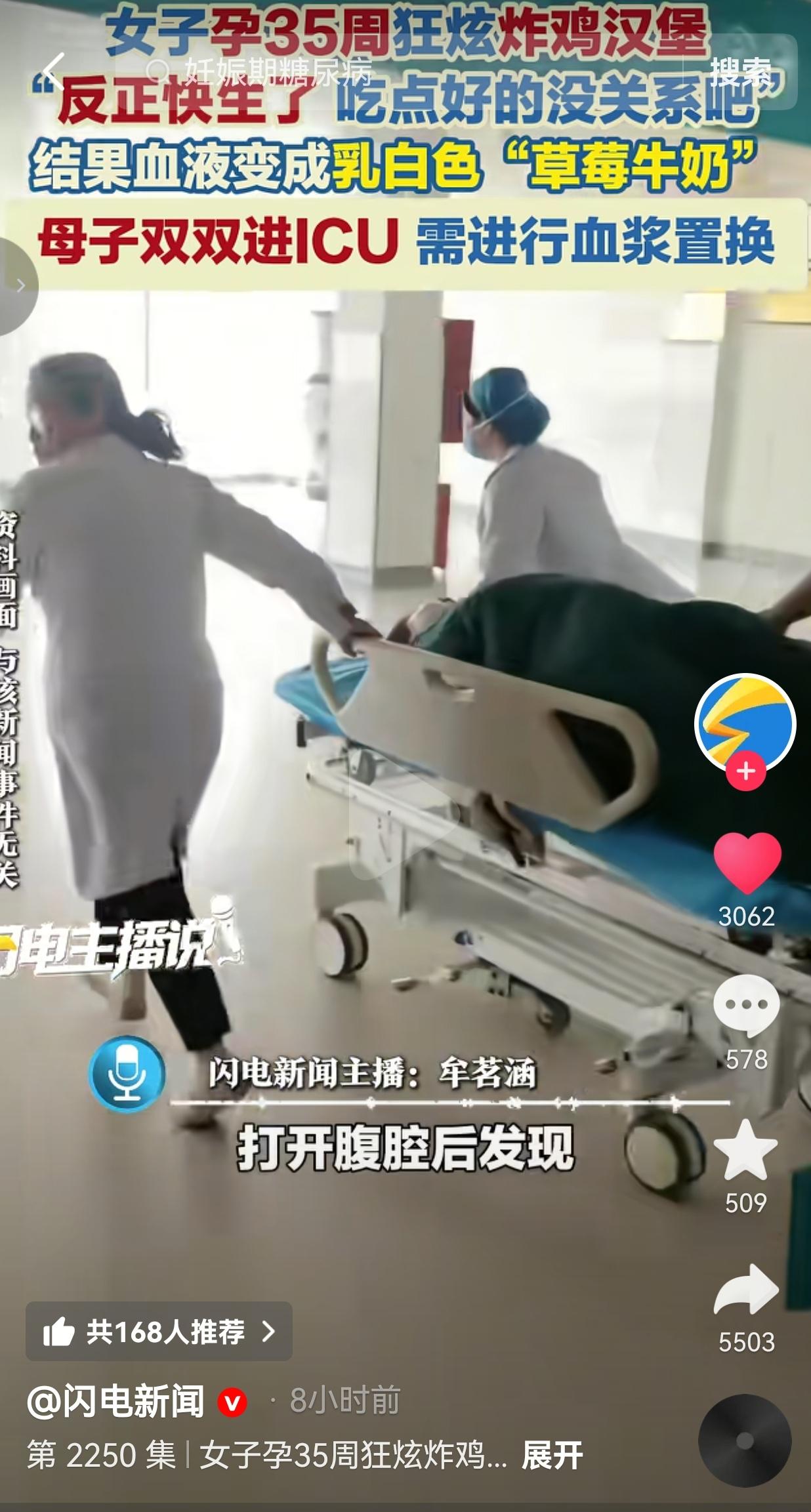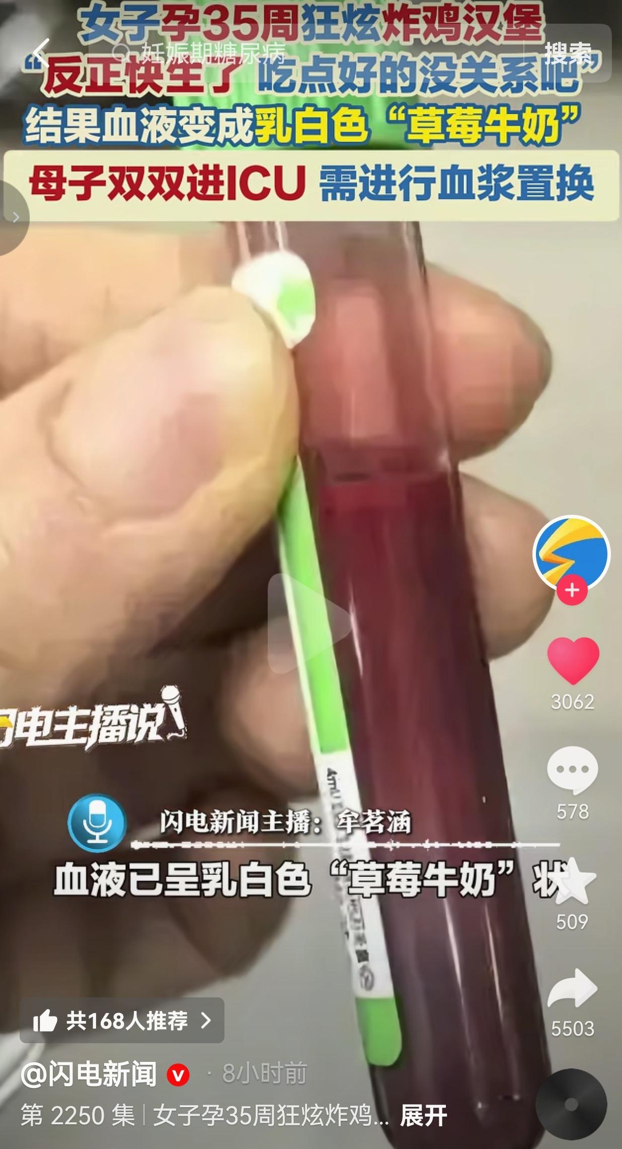 这根本不是补营养,是拿命赌!28岁孕妈孕35周,仗着“快生了没关系”的心态狂炫炸鸡汉堡,结果血液直接变成乳白“草莓牛奶”,胎盘更是裹满厚厚白油,最后母子双双进ICU抢救,差点一尸两命! 28岁的孕妈小张,本来她整个孕期都特别听话,因为查出了妊娠期糖尿病,医生反复强调要管住嘴、控糖控脂。 谁知道到了孕35周,眼看马上就要卸货,她心态直接崩了:反正都要生了,最后这几天吃点好的怎么了? 就这么一念之差,她彻底放飞自我!这一周里,每天都是炸鸡、汉堡配冰可乐,顿顿红烧肉、重油重盐,每一顿都吃到撑得走不动路,硬生生把身体给吃垮了! 结果真的出事了!那天小张突然腹痛难忍,疼得直不起腰,家人吓得赶紧送医。 抽血化验的时候,医生当场惊呆了:她的血根本不是正常的红色,而是乳白乳白的,就像兑了奶的草莓汁,看着就让人头皮发麻! 一检查,确诊是高脂血症性胰腺炎!医生当时就严肃表示,这种病在临床上极其凶险,随时可能引发多器官衰竭,死亡率非常高,再晚送来一步,后果都不堪设想! 情况十万火急,医生只能立刻进行紧急剖宫产。 打开腹腔的瞬间,场面把手术医生都吓一跳:腹腔内全是油脂,连胰腺都被厚厚的脂肪泡坏了!更让人后怕的是,胎盘表面都覆着一层厚厚的白色油脂,等于孩子在肚子里是泡在油脂里生存的! 万幸的是,孩子顺利取出了,但因为情况危重,还是直接送进了新生儿ICU。 小张自己也因为病情危重,被送进ICU做血浆置换,在鬼门关前闯了好几天,才勉强转危为安。 好好的孕期,好好的母子,就因为最后一周的一时嘴馋,硬生生把自己和孩子作进了ICU,遭了这么大罪,真是让人又气又心疼!   网友看到后评论说:“这血的颜色看着太吓人了!都有妊娠糖尿病了还敢这么造?真的是拿自己和孩子的命在赌啊!” 也有的网友说:“我真服了!医生没跟你敲警钟吗?最后一周放飞自我?这哪是放飞,是玩命!代价太大了!” 还有的网友说:“太心疼那个孩子了!还没出生就跟着遭罪,妈妈一口嘴馋,孩子要在ICU里受多少罪?当妈了能不能有点责任心!” 更有网友说:“总有人觉得‘快生了没事’,出事了才拍大腿!孕期饮食真的半点不能马虎,这不是矫情,是保命!”   说实话,我真的想不通,都是当妈的人了,怎么能这么不负责任?整个孕期都忍饥挨饿、小心翼翼,就差最后这几周,非要胡吃海塞?你以为是补营养?你是在给身体喂毒!炸鸡、汉堡、红烧肉,全是高油高糖高脂,本来就有糖尿病,你这不是雪上加霜是什么? 你自己不讲究就算了,肚子里还有个孩子啊!你一口一口吃进去的不是美食,是给孩子喂的毒药!好好的孩子,还没出生就被迫提前剖宫产,一出生就进ICU,要承担多少风险?连胎盘都被你吃的油裹满了,你是真的一点都没为孩子想过! 最可气的就是这种心态:“反正快生了,吃点好的没关系”!什么叫没关系?命都快没了还叫没关系?把医生的话当耳旁风,拿自己的身体和孩子的安全当儿戏! 孕期不是你放飞自我的借口,更不是你胡吃海塞的理由!管住嘴不是委屈自己,是对自己负责,更是对肚子里的孩子负责!多少孕妈整个孕期都在忌口,就为了孩子能平安出生,你倒好,临门一脚,把自己和孩子都送进了ICU! 这件事最戳人的,根本不是吃了什么,而是当妈的责任感!当你决定要孩子的那一刻,你就不是一个人了,你的每一口吃的,每一个选择,都牵着另一条小生命! 最后我想说:孕期无小事,一口贪嘴,可能就是一生的遗憾! 别拿“快生了”当借口,别拿“补营养”当幌子,管住嘴,迈开腿,听医生的话,才是对自己和孩子最大的负责! 也给所有孕妈提个醒:孕期饮食,半点不能马虎!你的每一次放纵,都是在拿全家的希望赌!
