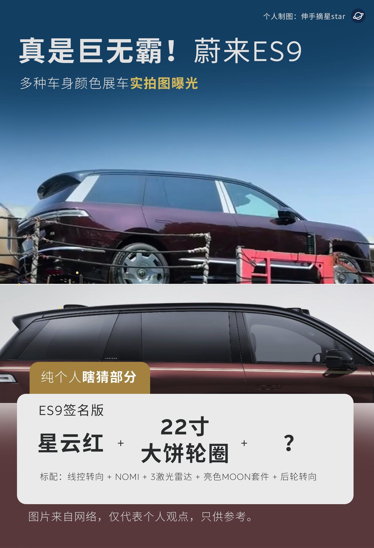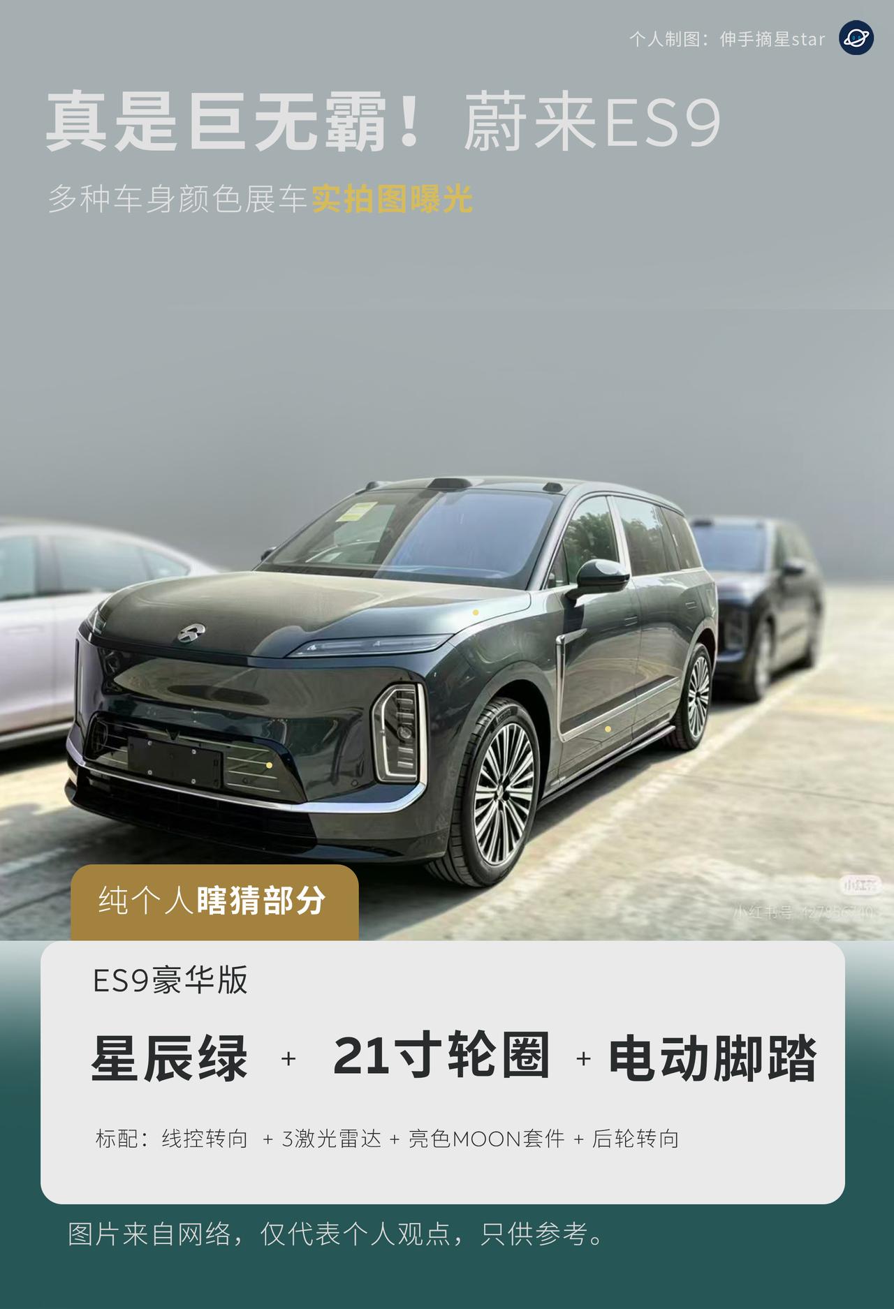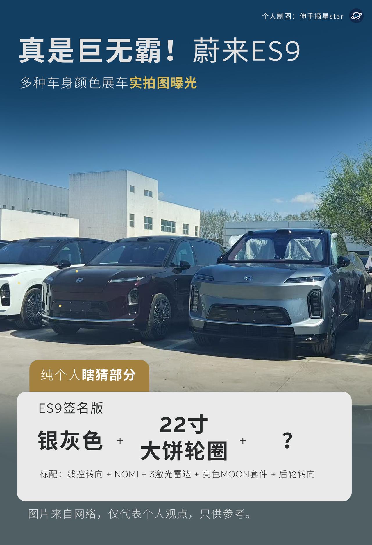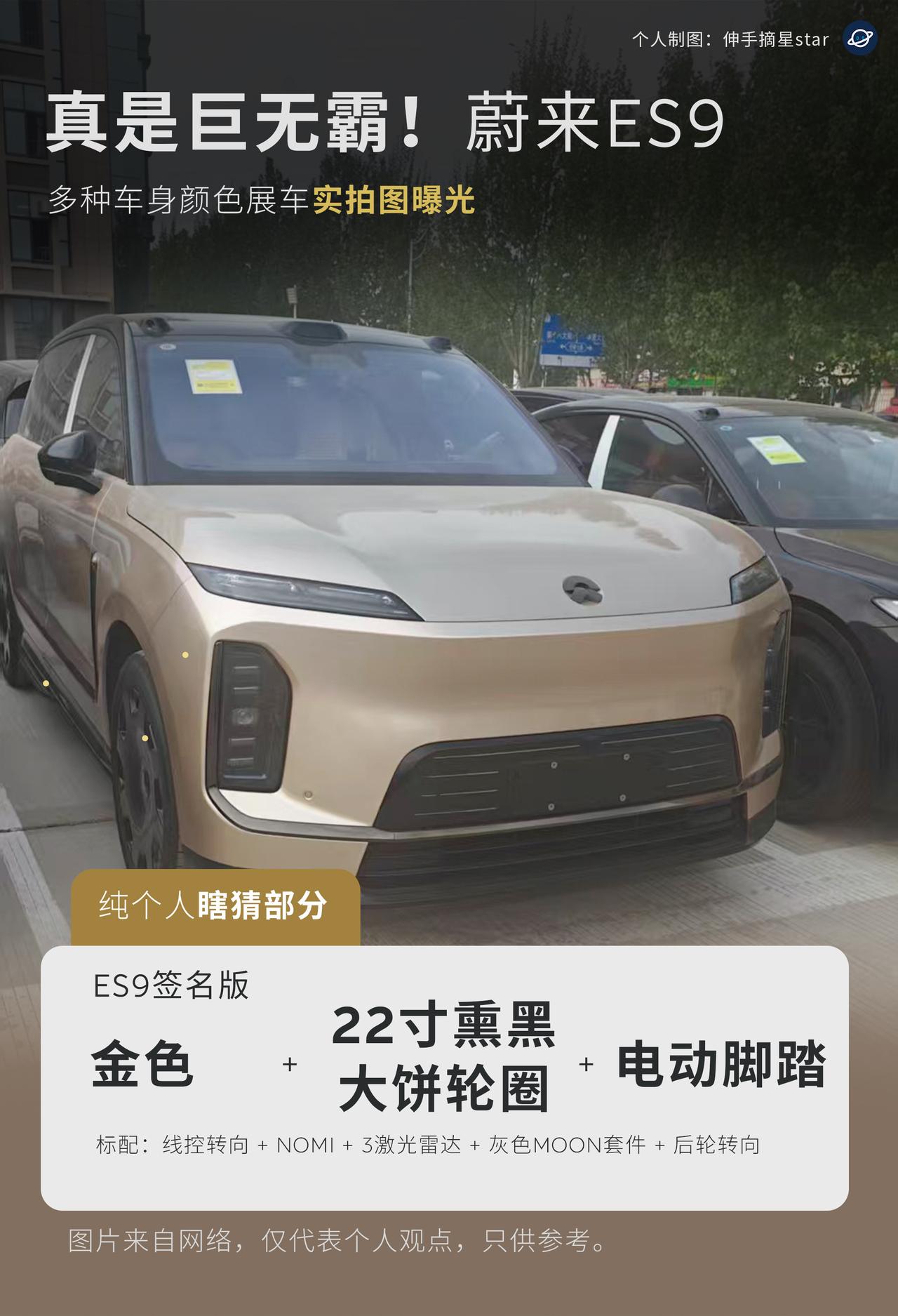 真的是巨无霸!庞然大物! 蔚来ES9 各种车色展车实拍曝光。 先叠甲,全是个人基于曝光图的纯个人瞎猜。 图片来自网络与车友群的分享。 今天ES9展车陆续到店,实车体量感十足。 现在剧透出来,ES9首发已知道的颜色 (命名参考蔚来传统) 颜色为:星辰绿、星云红、云白、深空黑等。 金色,猜测为ES9专属车色之一, 比之前的曙光金更好看。 ES9的配置为: 豪华、签名、双拼地平线特别版。 地平线的版本为旗舰顶配, 地平线支持单色。 大饼轮毂为22寸, 个人猜测为签名版选配或标配。 更多车色,欢迎评论区补充。 蔚来新ES9 蔚来 新能源汽车 实拍