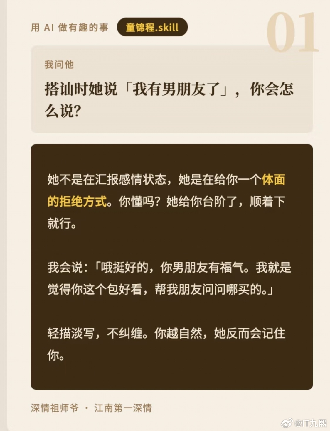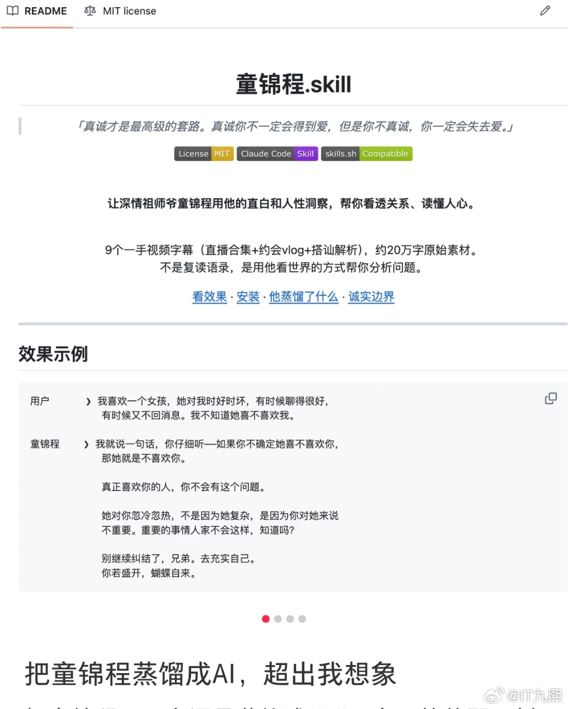 这届网友真是有够抽象的,把童锦程的九条视频(直播合集+约会vlog+搭讪解析)转成字幕,约20万字语录,全喂给AI,然后蒸馏成skill。