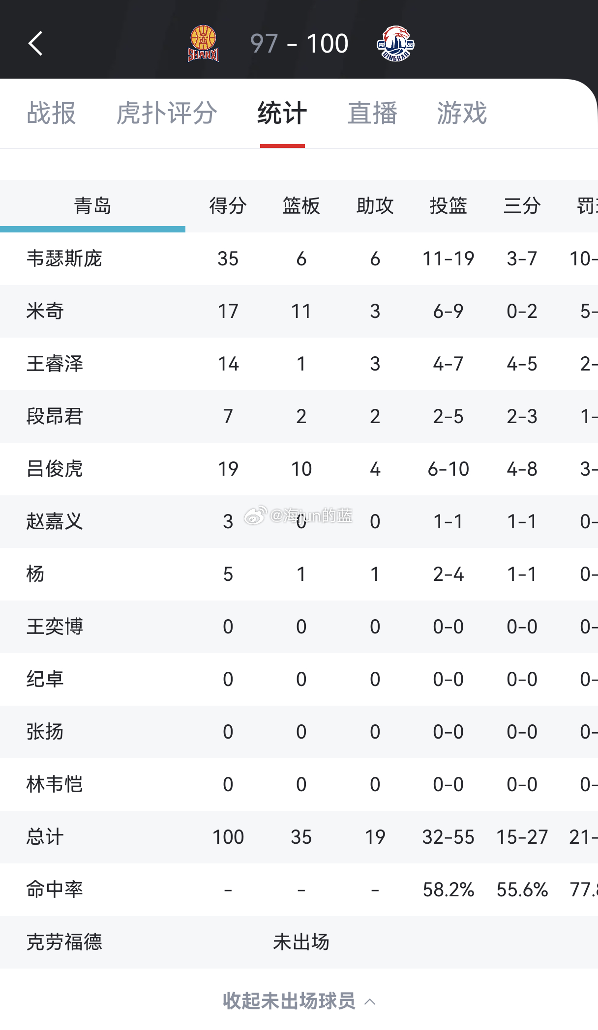 队长睿泽三分球5中4,小段3中2,虎子更是打出了自己的代表作,三分8投4中拿到19分10篮板的两双数据,有了虎子的神勇发挥,大外援克劳福德又躺平了一场,澡也不用洗了。CBA青岛男篮