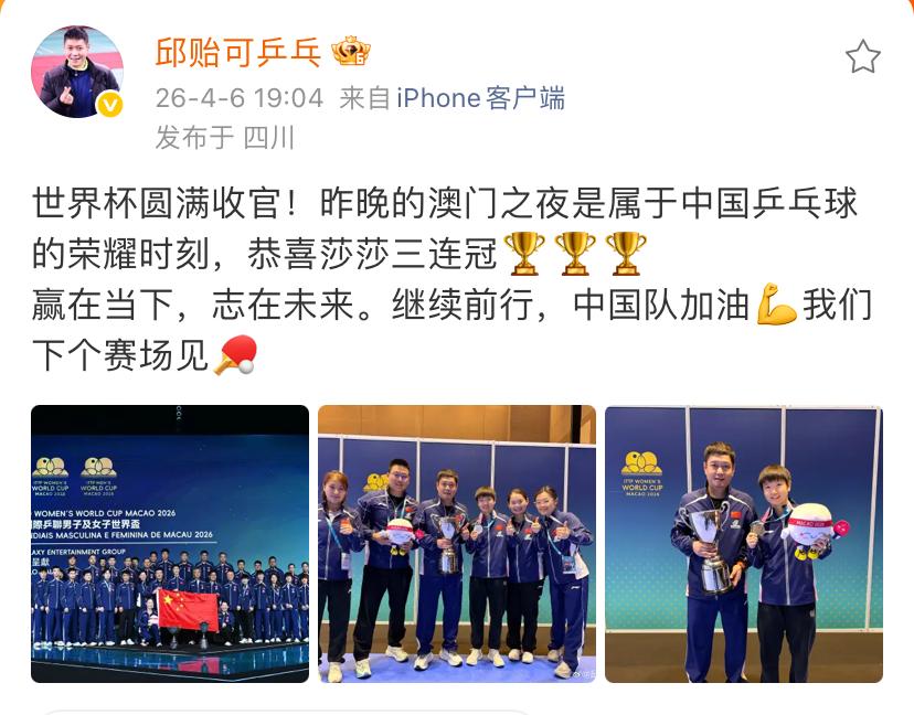 邱贻可不但恭喜孙颖莎, 还配了三张图片, 每一张都有孙颖莎。 第一张图片是国乒大合照, 莎莎在马琳和王曼昱中间, 每个人脸上都有着开心的笑容。 第二张图片是6个人的合照, 邱贻可捧起奖杯, 何卓佳点赞。 第三张图片是2个人合照, 属于师徒的荣誉, 携手再创佳绩。 志在未来, 让我产生共鸣, 世乒赛加油。 突然想起孙颖莎一句话, 每一场比赛都会去全力以赴。