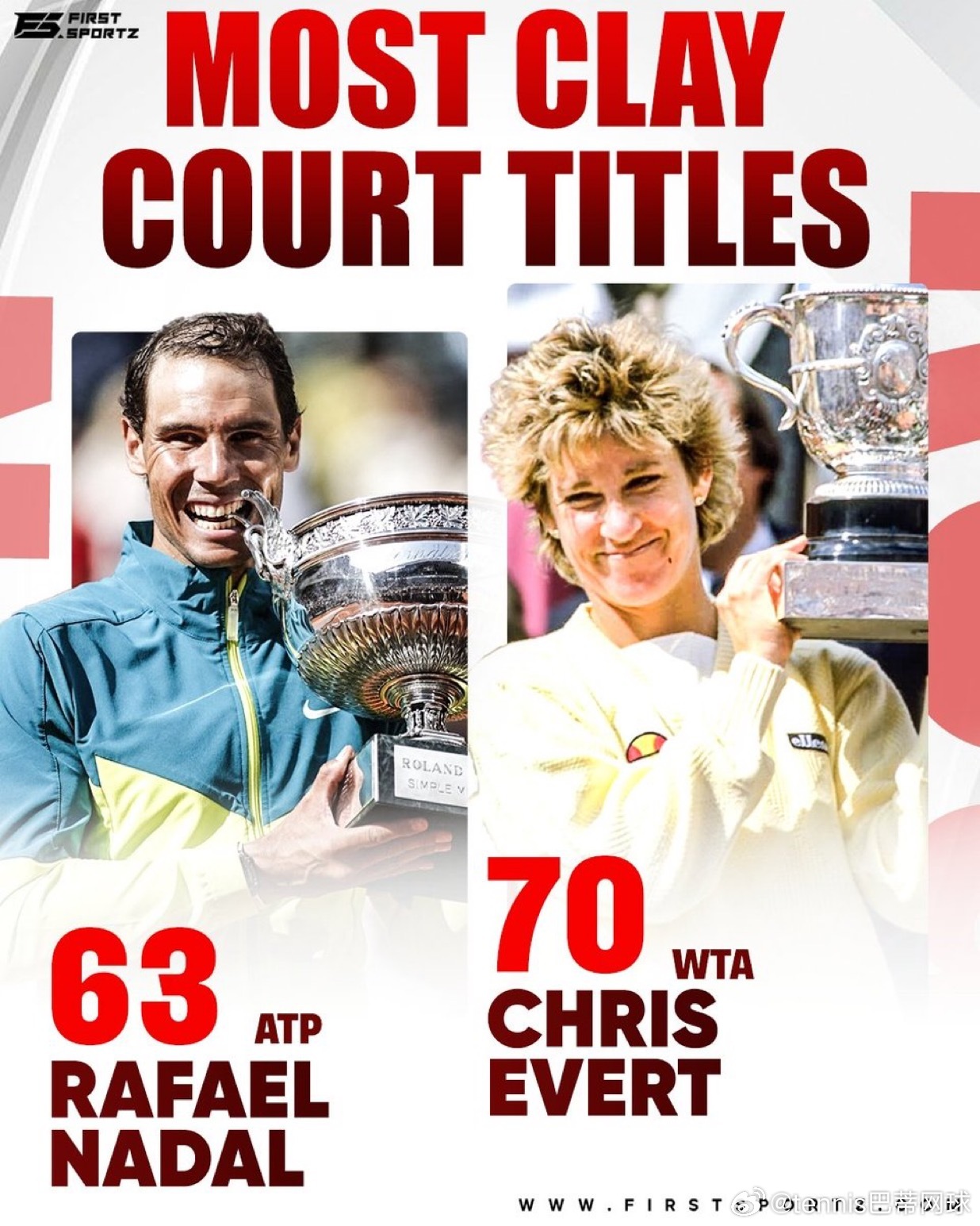 ⭐️🇺🇸埃弗特则用70座红土冠军树立了统治力标杆。她在红土上共夺得10座大满贯冠军,包括7座法网冠军,以及美网改用红土场地期间拿下的3座美网冠军。1973年8月至1979年5月,埃弗特在红土创下125连胜,是公开赛年代所有球员中单一场地最长的连胜纪录‼️