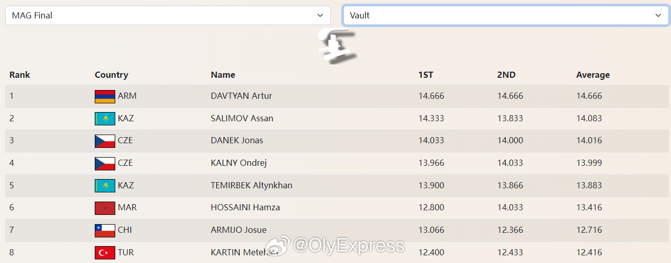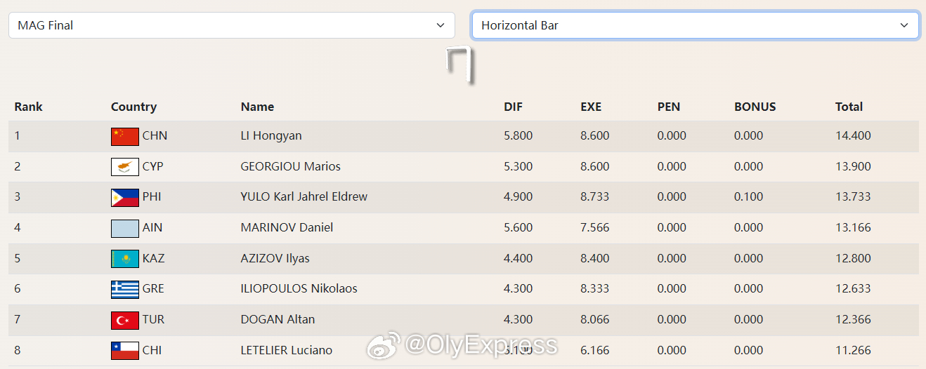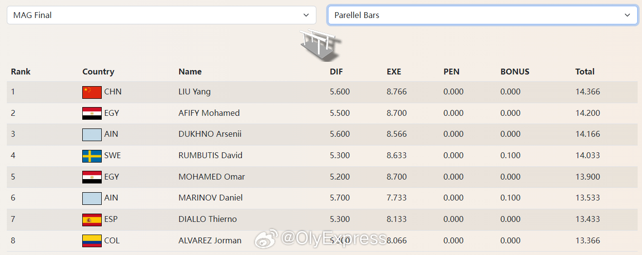 【体操世界杯中国再夺3金1银1铜 李鸿颜刘洋柯沁沁夺冠】国际体坛战报速递 4月6日开罗,体操世界杯埃及站第二决赛日,中国选手发挥出色夺得3金1银1铜。李鸿颜以14.400分获得男子单杠金牌;来自湖南的00后选手刘洋以14.366分夺得男子双杠金牌;柯沁沁在女子自由操比赛中以12.966分夺得冠军。柯沁沁和邱祺缘在平衡木比赛中获得银铜牌。阿尔及利亚名将内莫尔以14.266分的断层优势夺得个人第二冠,柯沁沁和邱祺缘的成绩分别为13.166分和12.833分。