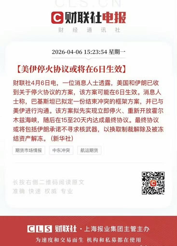 史诗级利好!美伊停火落地,A股原油今晚明天全线起爆! 如果美伊停火协议真的落地,对全球资本市场就是史诗级利好!今晚美股、明天A股,大概率迎来报复性大涨,原油等大宗商品则会迎来暴跌,整个市场风险偏好将彻底反转。 霍尔木兹海峡一旦重新开放,全球能源供应链的最大警报直接解除,国际油价会快速回落,WTI原油从高位跳水几乎是板上钉钉。 就在4月6日,据央视新闻、路透社等多家权威媒体同步披露,由巴基斯坦拟定的停火框架方案,也就是暂定名的“伊斯兰堡协议”,已经正式提交至美国与伊朗双方。 方案核心内容直指市场最关注的两大核心——立即实现停火,同步重新开放霍尔木兹海峡,并留出15至20天的窗口期敲定更全面的和解协议。 这一消息的出现,直接给持续紧绷了一个多月的全球资本市场,投下了一颗足以扭转行情走向的“定心丸”。 要知道,自2月28日美以对伊朗发动军事打击以来,霍尔木兹海峡这条全球能源的“大动脉”就陷入了近乎停滞的状态,而它的每一次波动,都直接牵动着全球经济的神经。 冲突爆发之后,这条航道的通行状况急转直下。联合国贸易和发展会议联合海事咨询机构克拉克森发布的数据显示,冲突前霍尔木兹海峡日均船舶通行量约129艘,而进入3月后,这一数字暴跌超95%,多数时段日均通行量仅剩个位数。 全球能源供应链直接陷入了“心脏骤停”的状态,市场对原油供应短缺的恐慌情绪,被推到了极致。 正是能源通道的阻断,让国际油价在过去一个多月里开启了疯狂上涨模式。 布伦特原油从冲突前的80美元/桶附近一路冲高,站稳110美元/桶关口,多家机构曾发出警告,若海峡持续关闭到5月之后,油价甚至可能飙升至150美元/桶以上,极端情况下不排除突破200美元/桶的可能。 油价的持续暴涨,直接推高了全球的输入性通胀压力,也让全球资本市场陷入了持续的避险行情。 过去两周,美股三大指数连续下挫,纳斯达克指数单周暴跌超9%,创下3年以来最大单周跌幅;A股市场同样承压,上证指数累计回调近6%,北向资金连续多日净流出,累计流出规模超300亿元,市场风险偏好降至冰点。 而一旦美伊停火协议正式落地,霍尔木兹海峡恢复正常通航,首当其冲被改变的,就是国际原油的供需格局。 过去支撑油价暴涨的核心因素,从来不是供需基本面的缺口,而是地缘冲突带来的供应中断风险溢价。当这一最大的不确定性消除,全球原油供应将快速恢复至正常水平,油价的高位跳水几乎没有悬念。 市场普遍预期,若停火协议正式官宣,今晚美股将迎来报复性反弹。道琼斯工业指数、标普500指数有望出现2%-4%的大涨,纳斯达克指数涨幅或超4%。 其中,对燃油成本高度敏感的航空板块、受益于流动性宽松的科技板块、以及通胀缓解后业绩修复的零售消费板块,将成为领涨美股的核心主线。 而对于明天开盘的A股而言,这场停火带来的利好,更是全方位、多维度的。作为全球最大的原油进口国,中国约40%的原油进口来自中东地区,其中绝大部分都需要经过霍尔木兹海峡。 油价的回落,将直接降低国内的进口成本,缓解输入性通胀压力,为国内的货币政策留出更充足的宽松空间。 从板块层面来看,多个赛道都将迎来确定性的业绩与估值双重修复。首先是航空、航运、物流等交通运输板块,燃油成本是这类企业最核心的成本项之一,油价的大幅回落,将直接增厚企业利润,成为停火利好下最直接的受益方向。 其次是原油下游的化工、化纤、塑料等制造业板块,原材料价格的下跌,将显著改善企业的盈利空间,扭转此前因成本高企带来的业绩承压局面。 同时,通胀压力的缓解,也将提振居民的消费意愿,食品饮料、家电、汽车等消费板块,也将迎来业绩修复的预期。 此外,随着市场风险偏好的全面回升,资金将从避险资产回流至成长赛道。以半导体、人工智能为代表的科技成长板块,将重新获得资金的青睐,叠加国产替代的长期政策支撑,有望成为A股反弹行情中的核心主线。 当然,我们也需要看到,目前停火方案仍处于提交审阅阶段,美国与伊朗官方均尚未做出正式回应。 据新华社援引《华尔街日报》的报道,伊朗方面迄今依然拒绝接受以开放霍尔木兹海峡为条件的临时停火,坚持要求达成永久停火协议,这也意味着最终的协议落地,仍存在一定的不确定性。 但不可否认的是,这份停火方案的出现,已经给持续升级的美伊冲突按下了“暂停键”,也给全球资本市场带来了久违的曙光。资本市场永远在交易预期,当最大的地缘风险出现缓和的信号,市场的情绪反转往往就在一瞬间。 对于全球投资者而言,接下来的48小时将成为关键的窗口期,一旦美伊双方正式确认停火协议,全球资本市场的史诗级反攻就将正式拉开帷幕。而对于A股投资者来说,这场由地缘缓和带来的行情机遇,已经近在眼前。