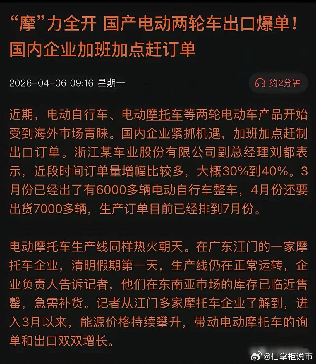 一夜之间,中国“小电驴”成全球香饽饽!海外订单接到手软,全球油改电浪潮来了?2026年,中国两轮电动车彻底引爆全球!从东南亚到欧美,从非洲到中东,中国制造的“小电驴”正成为海外消费者的“梦中情车”。为什么海外突然爱上中国“小电驴”?油价暴涨——2026年中东冲突推高国际油价,东南亚燃油摩托车使用成本激增,电摩每公里成本仅0.3元,是燃油车的1/20;政策加持——越南河内2026年7月起限行燃油摩托,印尼计划2030年普及900万辆电摩,多国“油改电”政策加速落地;中国智造——雅迪、台铃、小牛等品牌深度本地化研发,为欧洲定制高续航E-bike,为东南亚研发防锈涂层,为中东配置耐高温电池。英国《金融时报》罕见发声:能源结构转型、供应链多元化、物流通道优化,让中国两轮电动车出口商更具全球竞争力。从智能网联到换电网络,从本地化生产到技术标准,中国两轮电动车正在重塑全球出行格局!
