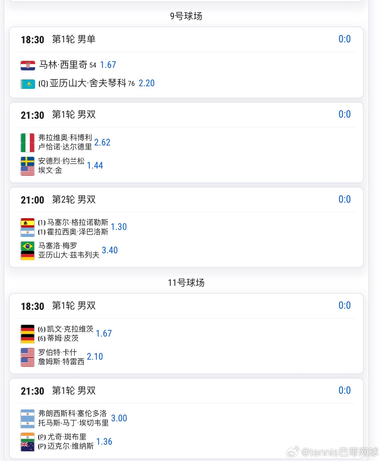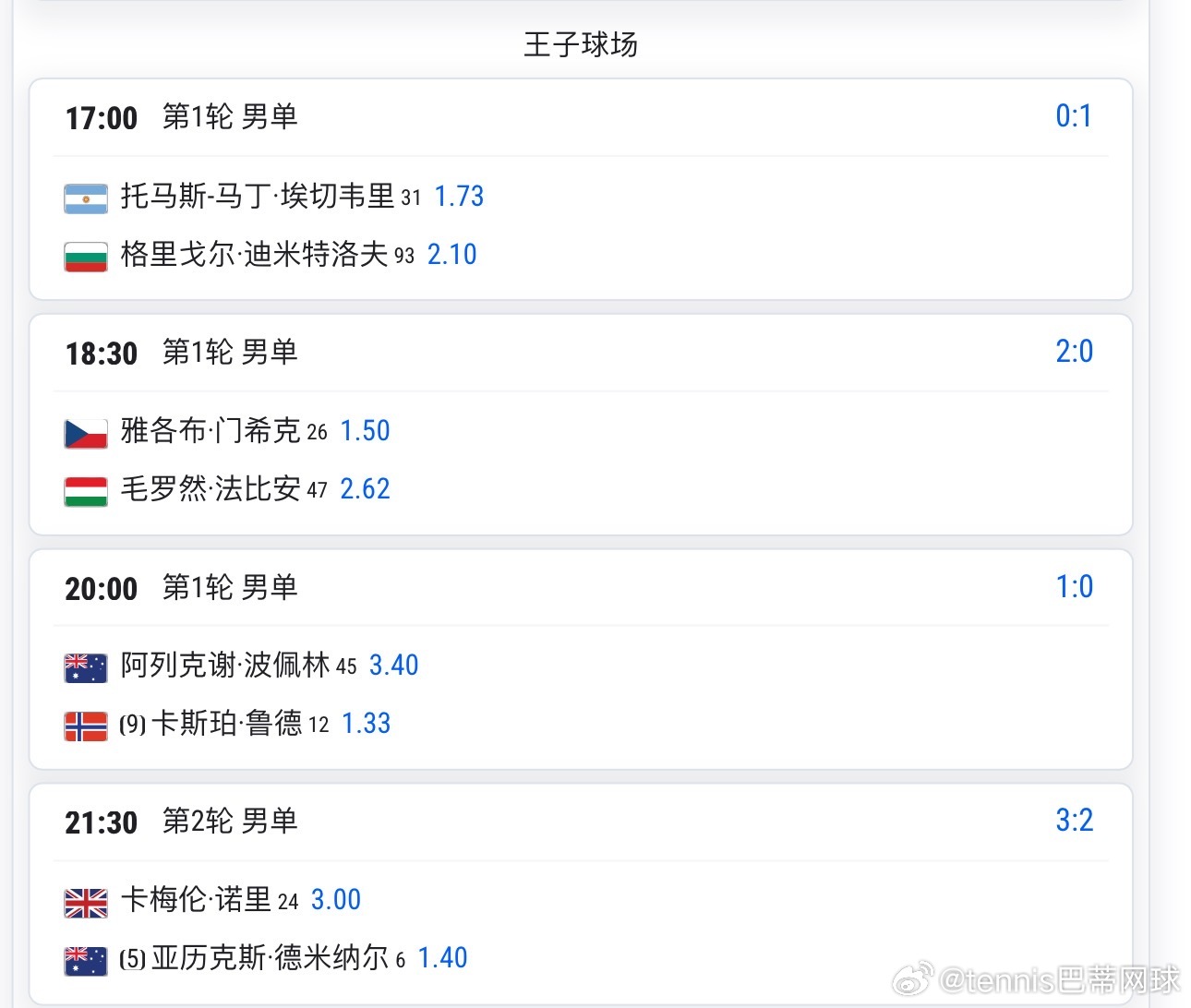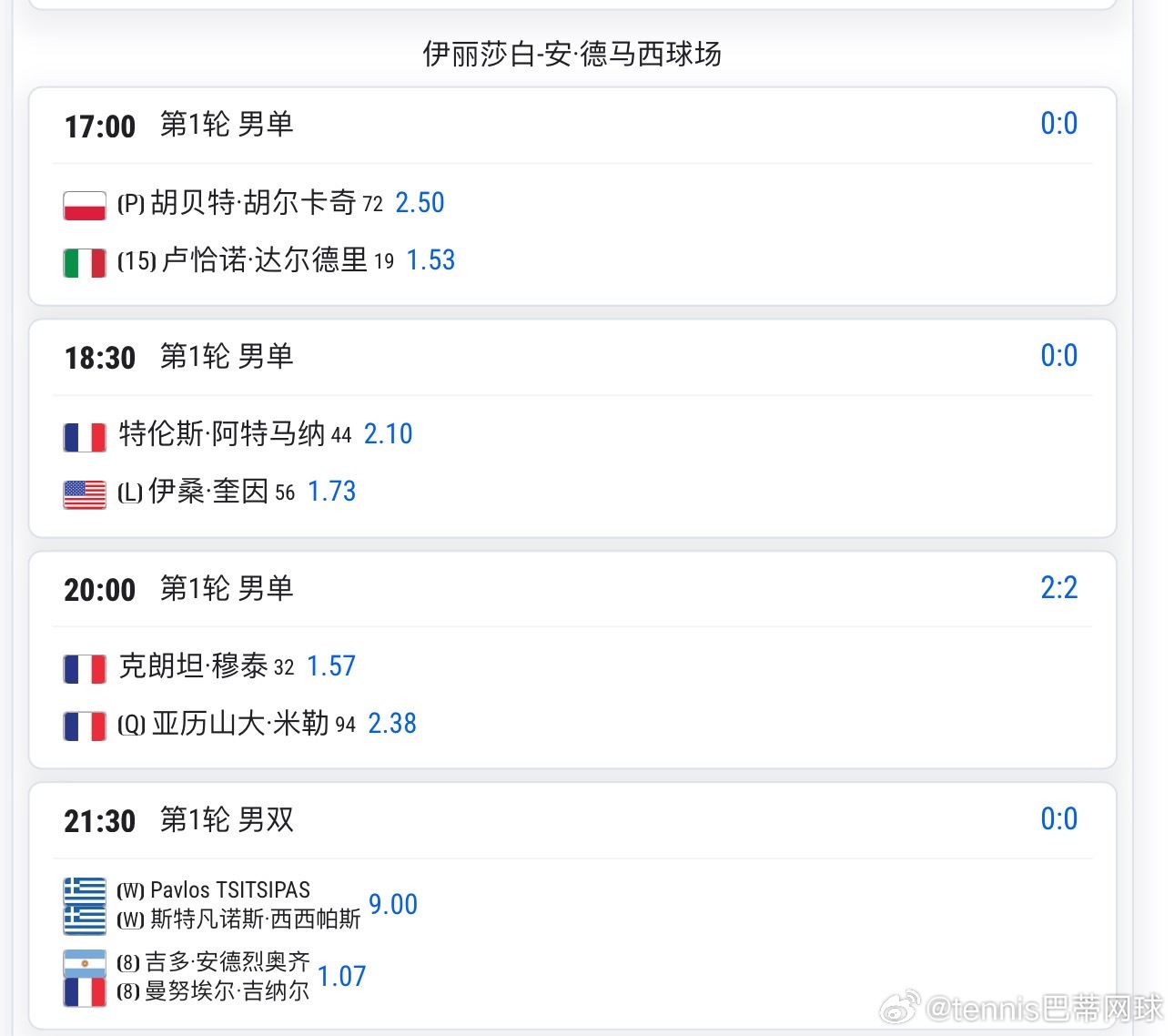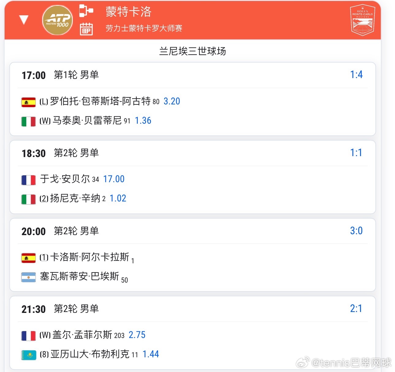 不早于18:30辛纳🇮🇹vs安贝儿🇫🇷随后阿尔卡拉斯🇪🇸vs巴埃斯🇦🇷