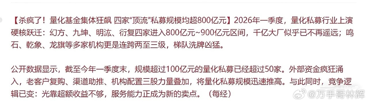 量化围猎下的散户困局:为何我们非要在中小盘里“送人头”?量化私募狂飙,幻方、九坤等四家顶流规模直冲800-900亿,百亿量化俱乐部已超50家。面对这支量化大军,A股散户却依然执迷于中小盘,非要去题材垃圾股里给量化“送菜”,转头又抱怨量化割得狠,这到底是为什么?其实很简单:散户的交易天性,撞上了量化的降维打击。很多散户不明白,量化在中小盘股里的掌控力有多恐怖。数据显示,小盘股成交里超50%是量化资金,它们手握微秒级极速通道,精准捕捉散户追涨杀跌的本能,制造假盘口、玩伪T+0,把散户的每一次冲动都变成精准收割。你以为是在博弈机会,实则是被算法提前锁定的猎物。可为啥散户就是不买大盘蓝筹?不是不想,是“暴富执念”打败了“风险意识”。蓝筹股波动小、涨得慢,不符合散户“一天一个板”的幻想;而中小盘题材股自带高弹性,哪怕是垃圾股,只要有个热点就能起飞,这种“一夜暴富”的诱惑,谁能扛得住?一个想赚快钱,一个有能力收割,这不就是赤裸裸的“愿打愿挨”吗?但市场的进化规律从来不会缺席。参考成熟市场的路径,当散户被中小盘的反复收割“割怕了”,不敢再碰纯题材垃圾股,被迫转向沪深300、中证A500等宽基ETF,以及银行、核心消费等权重蓝筹时,市场的慢牛根基才算真正筑牢。到那时,量化的野蛮收割会收敛,散户的博弈成本会降低,指数慢牛才会从预期变成现实。这不是鸡汤,是市场资金从“散兵游勇”到“机构化”的必经之路。